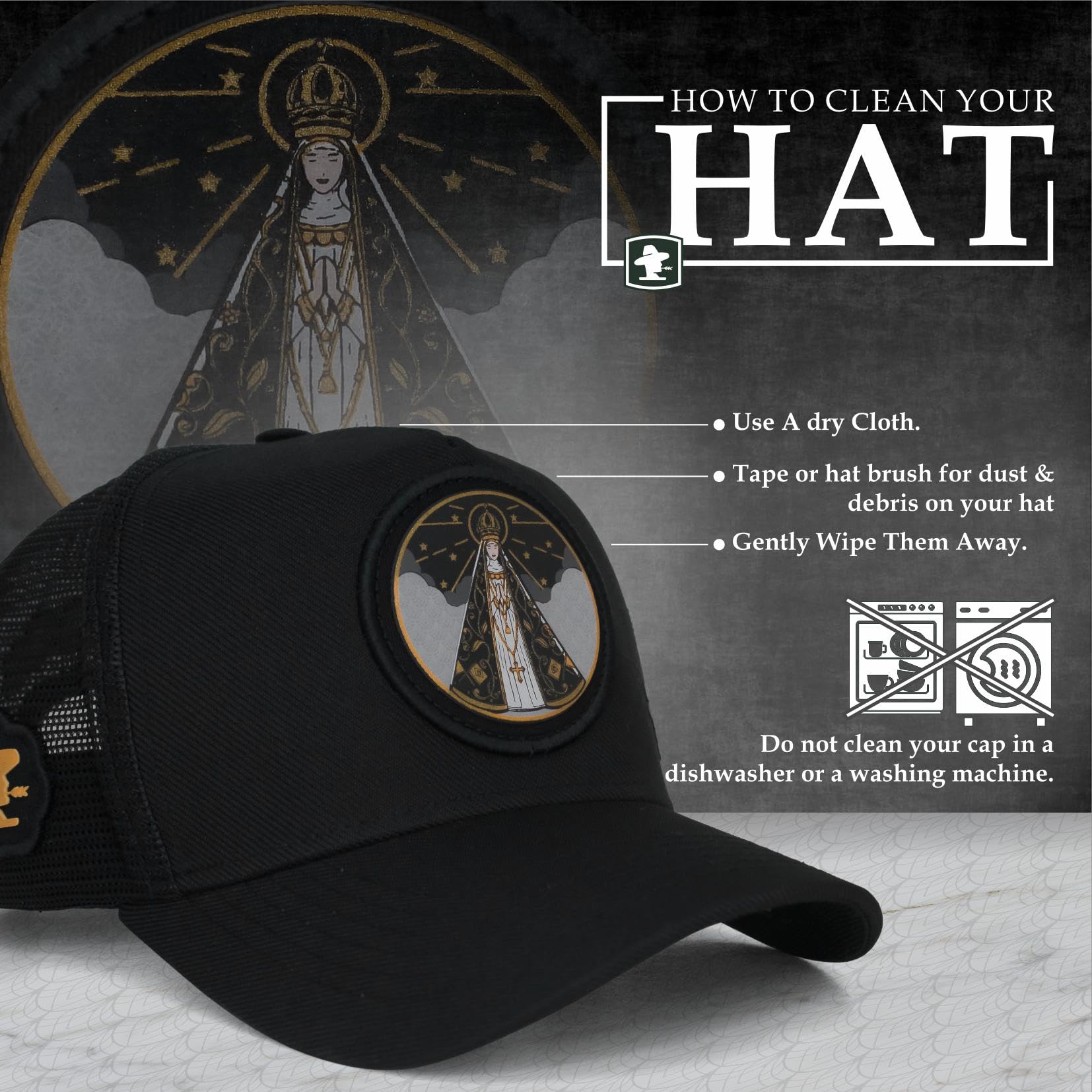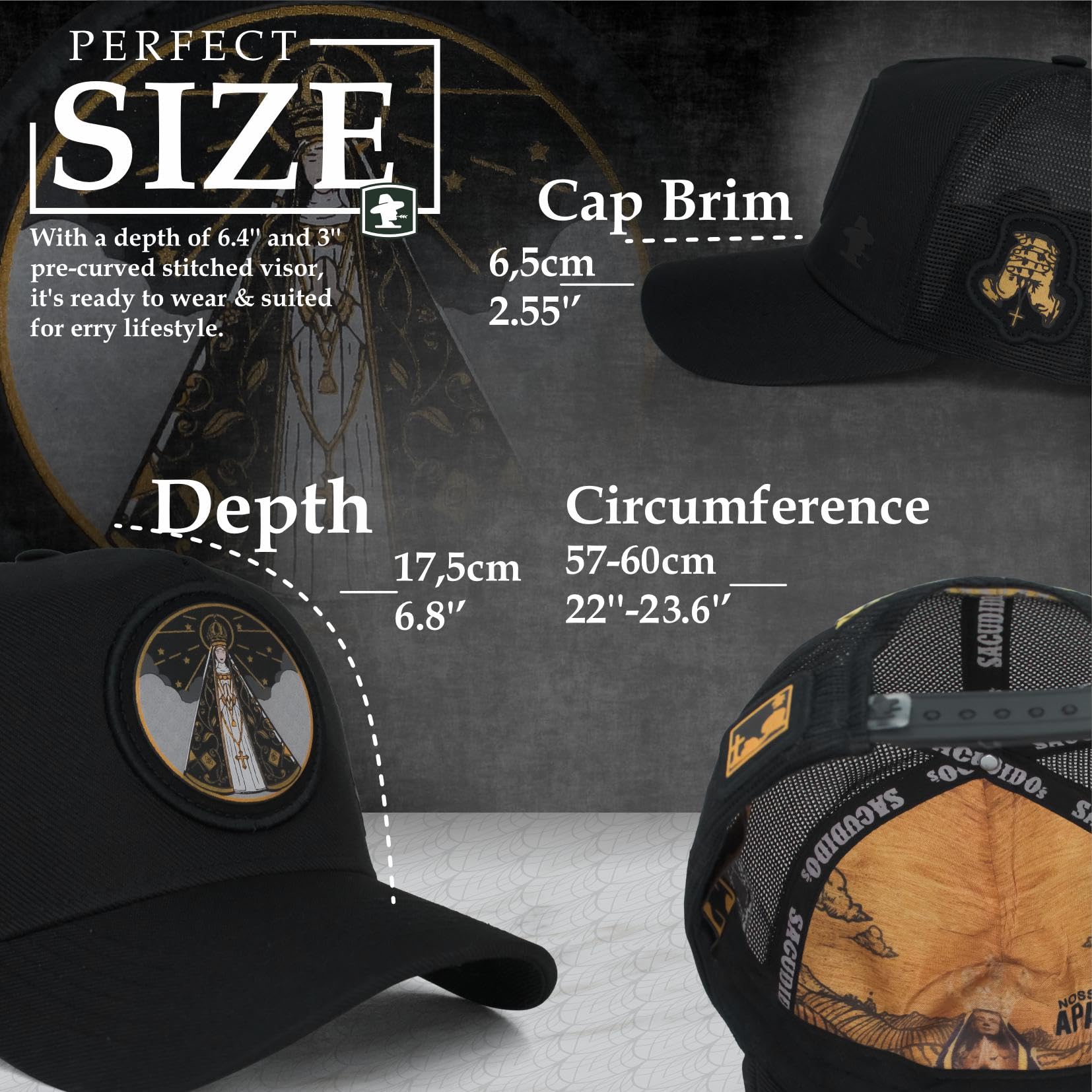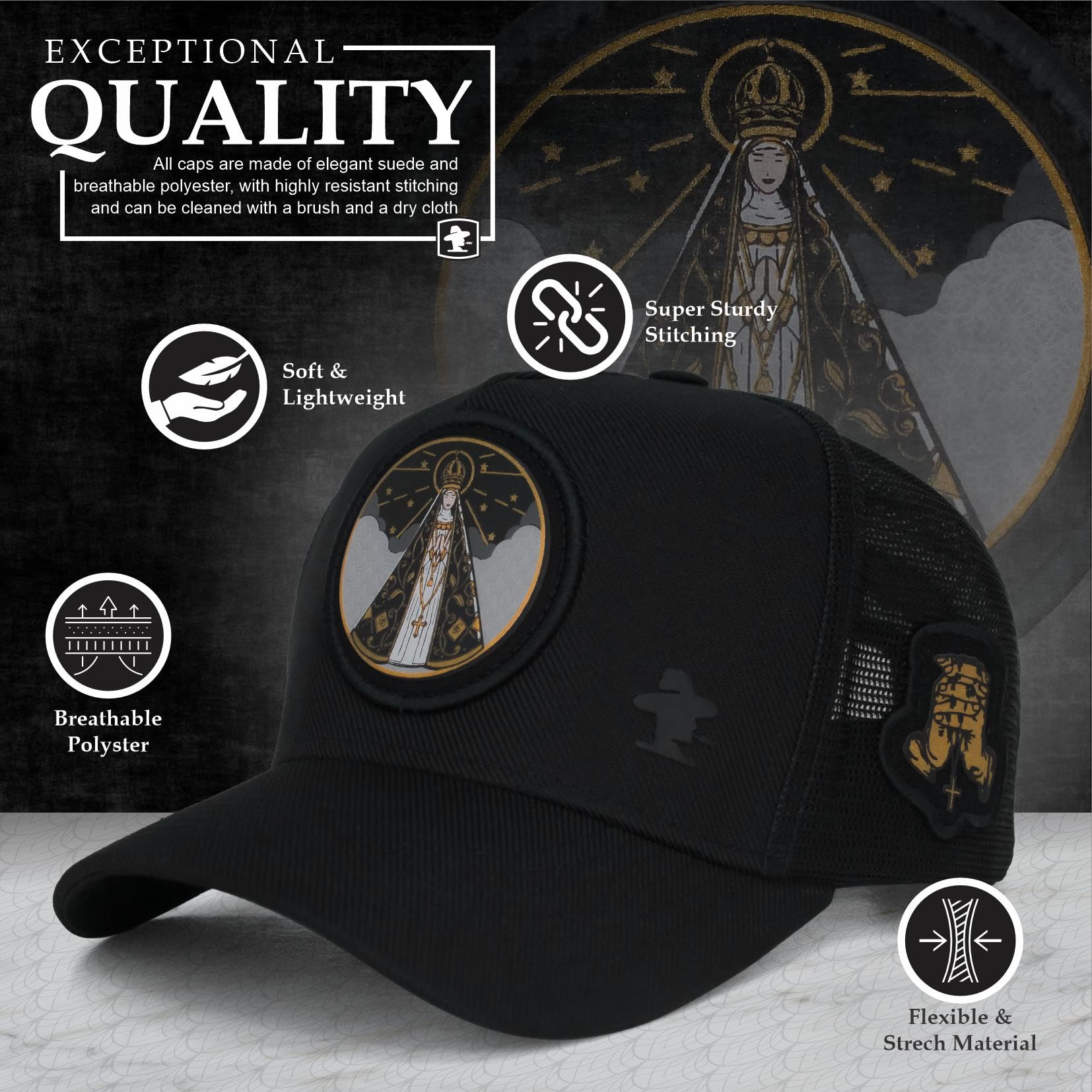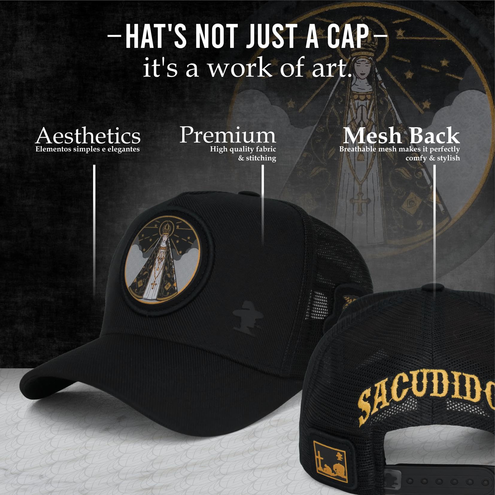 ABOUT THE PRODUCT: Show your Faith! The Sacudido's cap featuring Our Lady of the Immaculate Conception Aparecida for men and women is exceptionally comfortable and durable. Made with a premium blend of polyester mesh and suede fabric, it includes a laser-designed front pach, soft sweatband, custom internal lining, high-durability mesh, reinforced stitching, and an adjustable strap for a perfect fit.