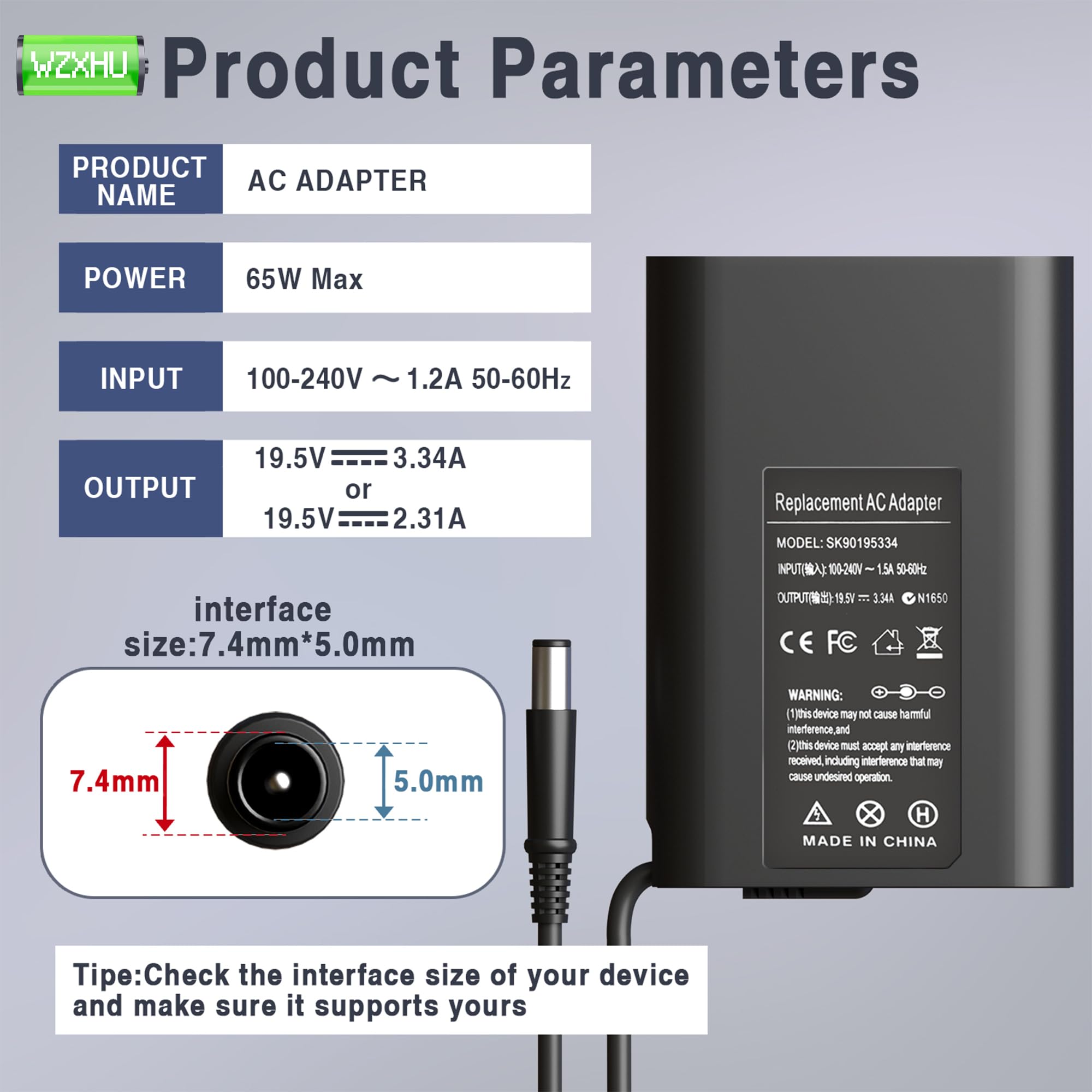 Output:19.5V 3.34A 65W, Input:100-240V 1.5 A 50-60Hz Connector tip: 7.4mmx5.0mm round tip