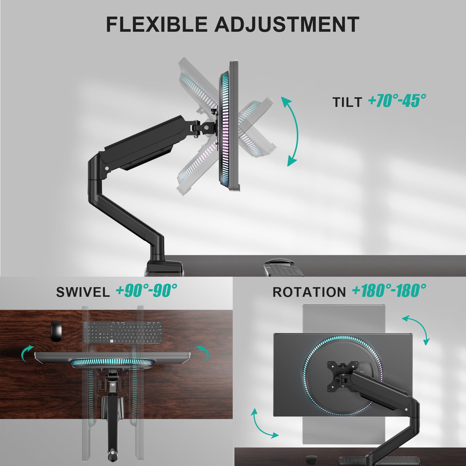 Full Adjustable: This monitor stand allows for full adjustment; it swivels +180°/-180°, tilts +70°/-45°,and rotates 360° for optimal workspace organization and efficient use of desk space. Its sturdy construction ensures long-term usability