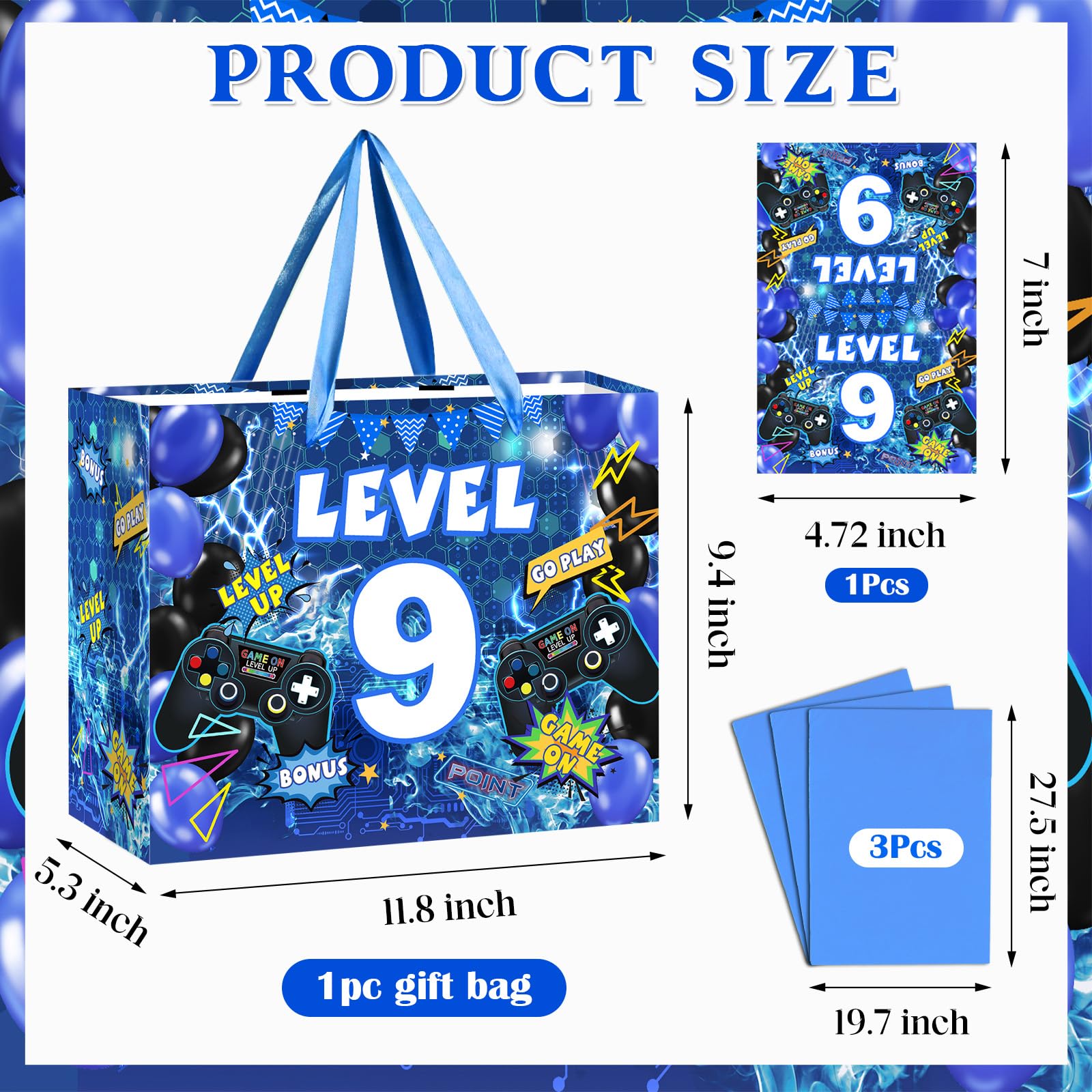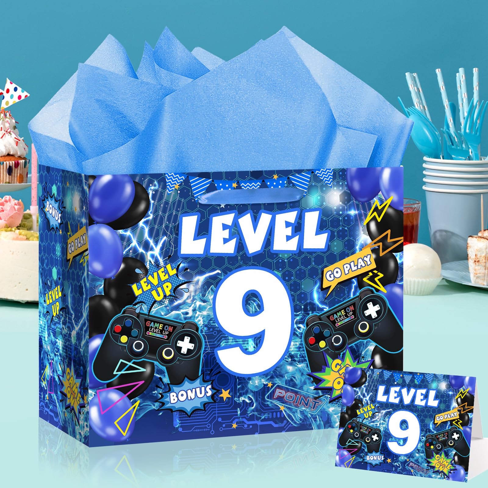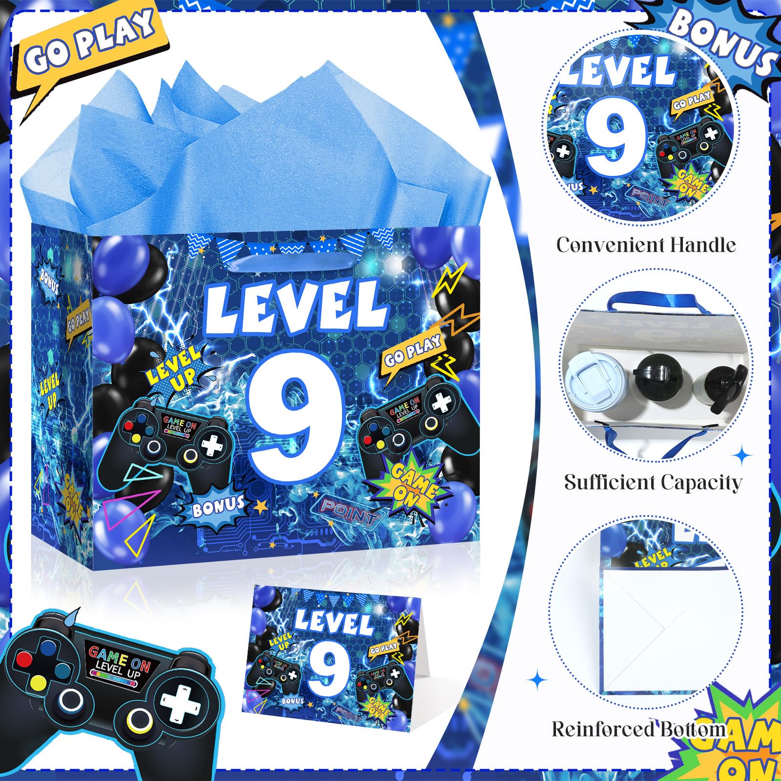 Blue game theme 9th birthday gift bags: Our video game 9th birthday party favor bags include a gaming gift bag, a gamer happy 9th birthday greeting card, and three easy-to-wrap wrapping papers. In addition, the gaming 9th birthday party goody bags is perfect for gifting to game lovers