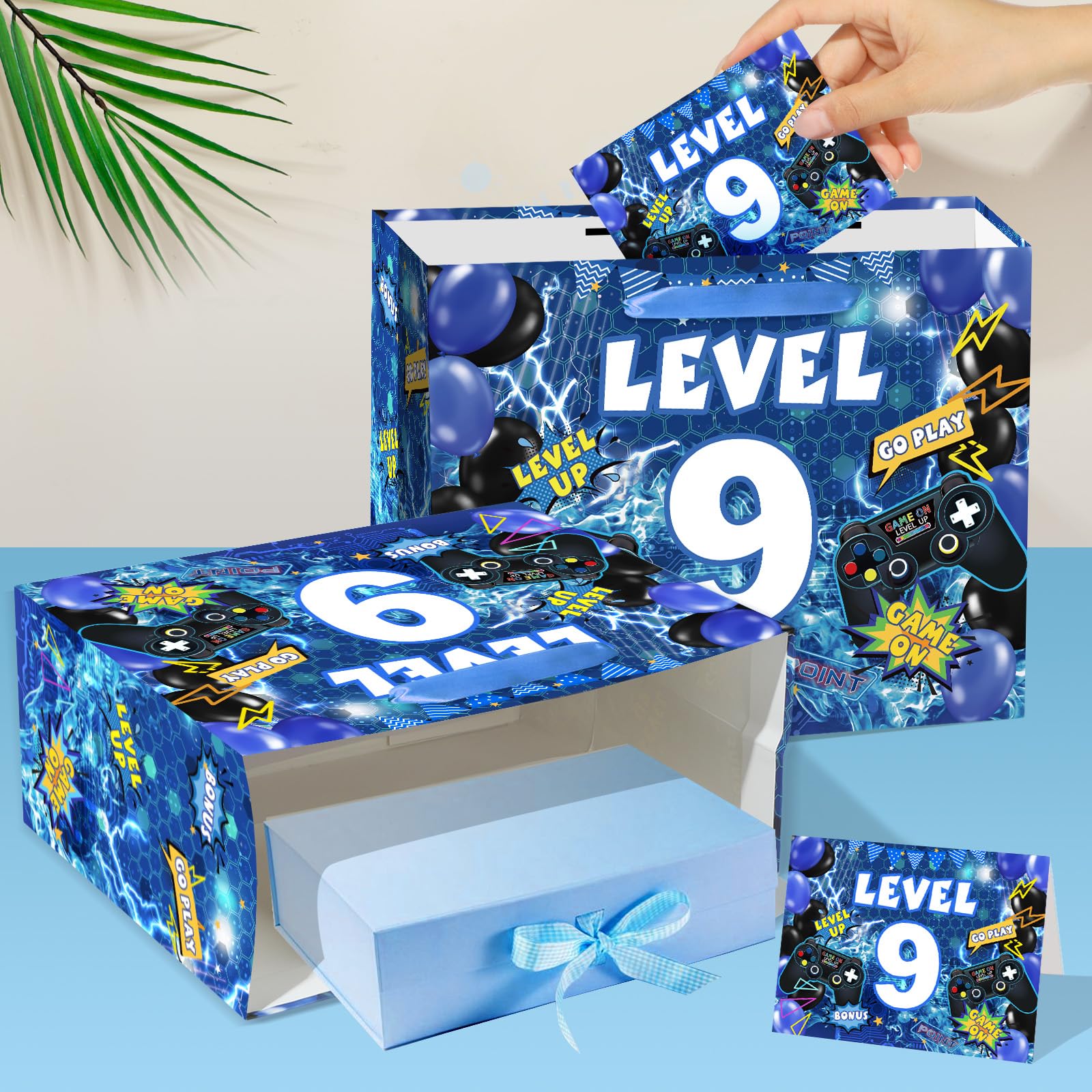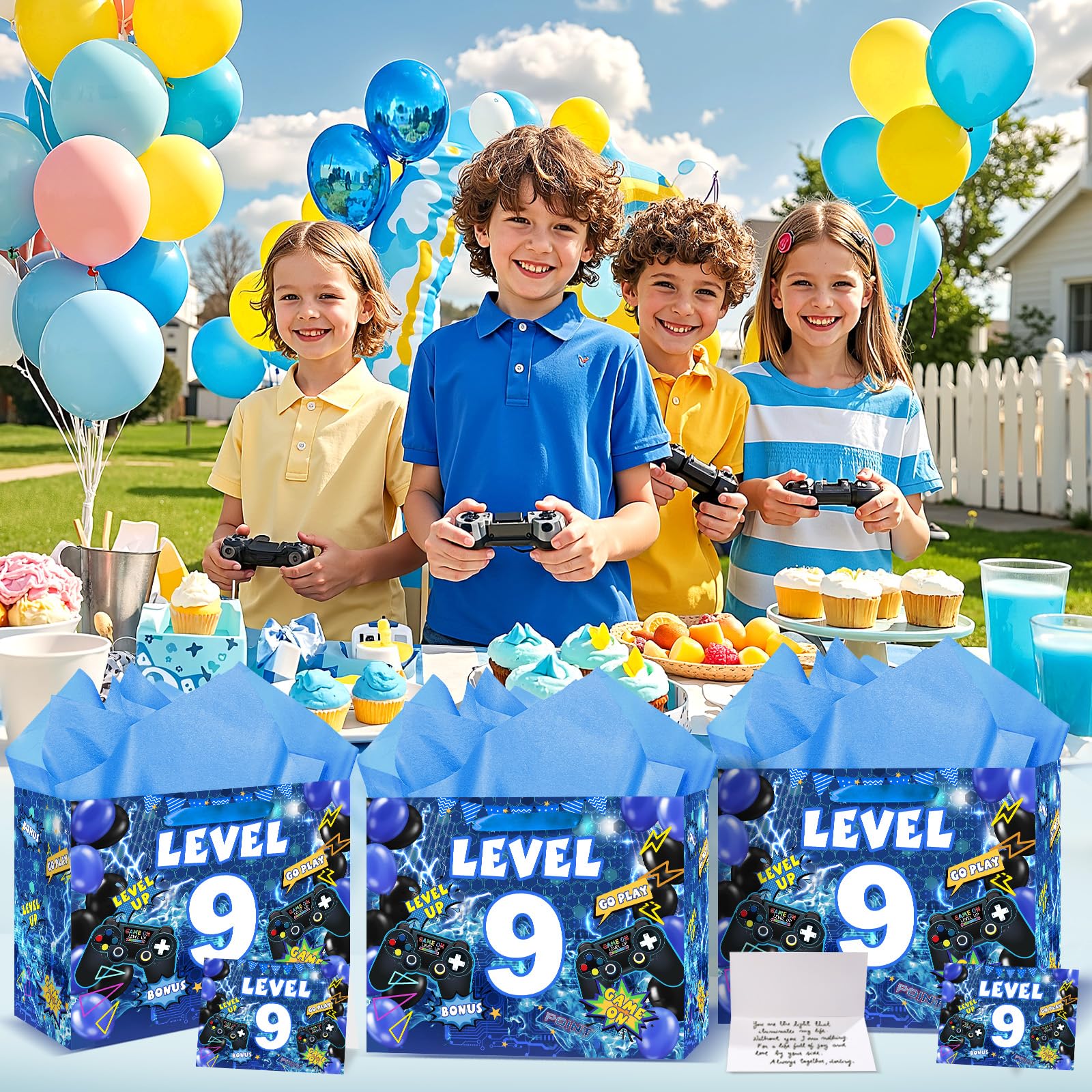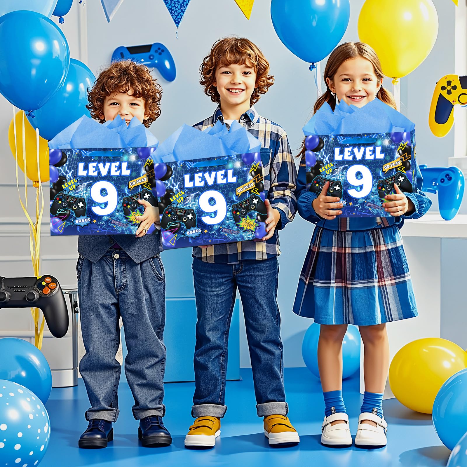 Blue game theme 9th birthday gift bags: Our video game 9th birthday party favor bags include a gaming gift bag, a gamer happy 9th birthday greeting card, and three easy-to-wrap wrapping papers. In addition, the gaming 9th birthday party goody bags is perfect for gifting to game lovers