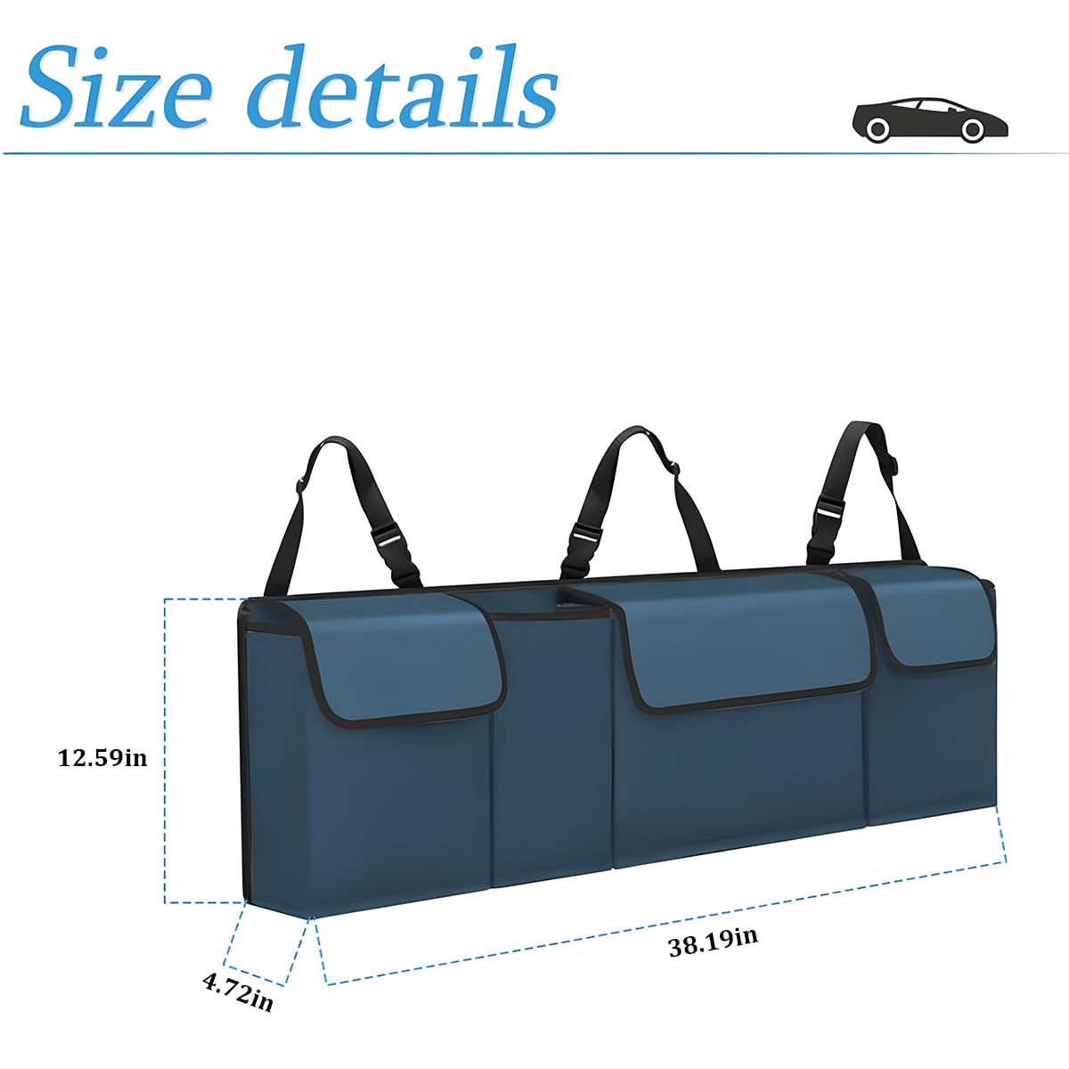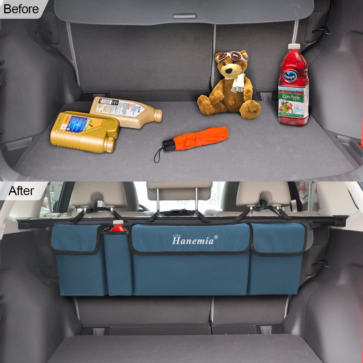 [A Must-have for Your Car] Our trunk organizer is made of premium 600D PVC fabric cloth, which is durable, stable and waterproof. There are 3 large pocket and a bottle holder with unique hanging design. Straps are strong, you don't need to worry about organizer falling down due to the heavy item. Like road traveling? This is an essentials on the road trip. Put anything you need in the organizer and you can find them easier and quicker.A great addition to your car trunk.