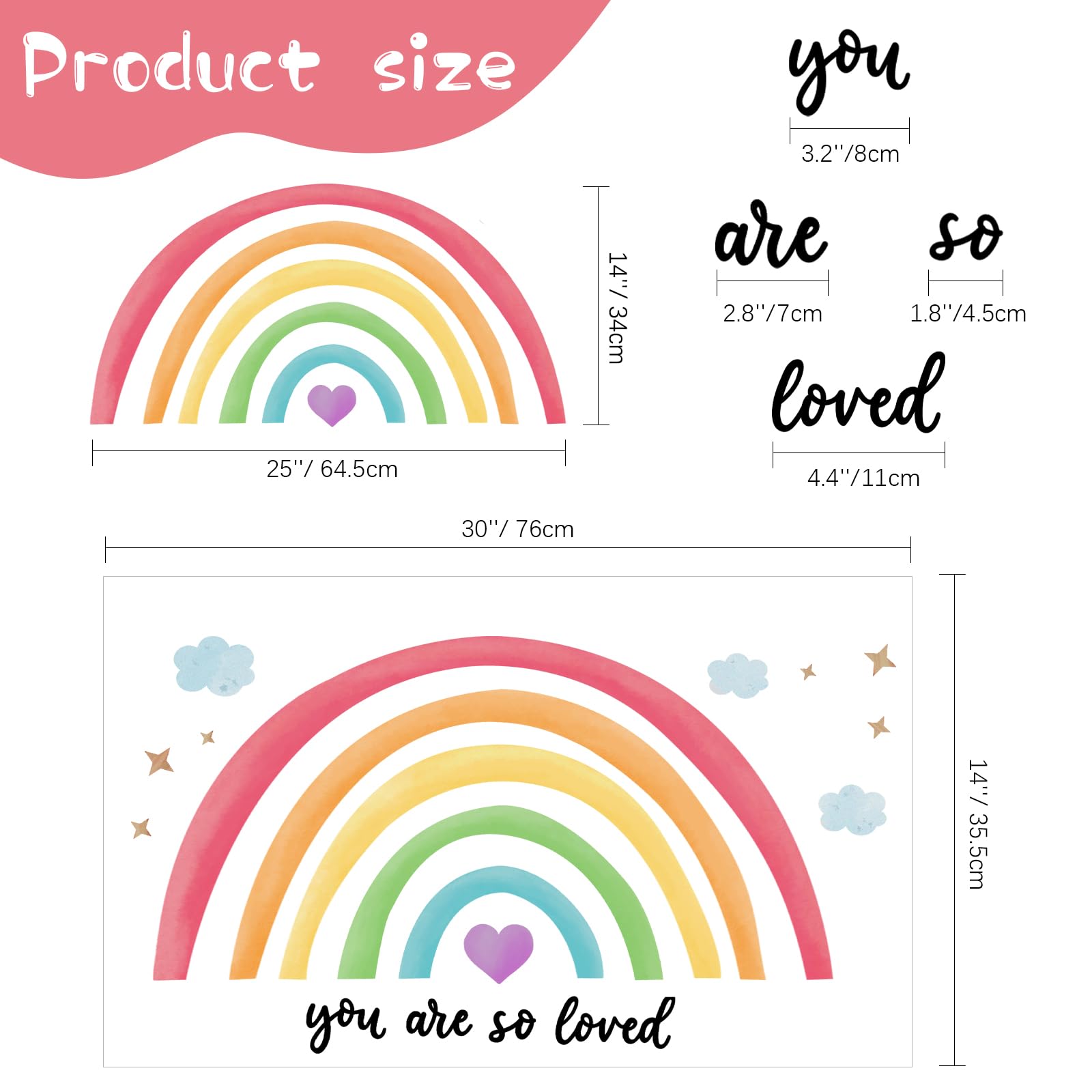 Large rainbow wall decal: toddler wall decals are approximately 30 x 14 inches/ 76 x 35 cm; There is a tip for you, to prevent curling after sticking, put kid room wallpaper under the weight and flatten them before using