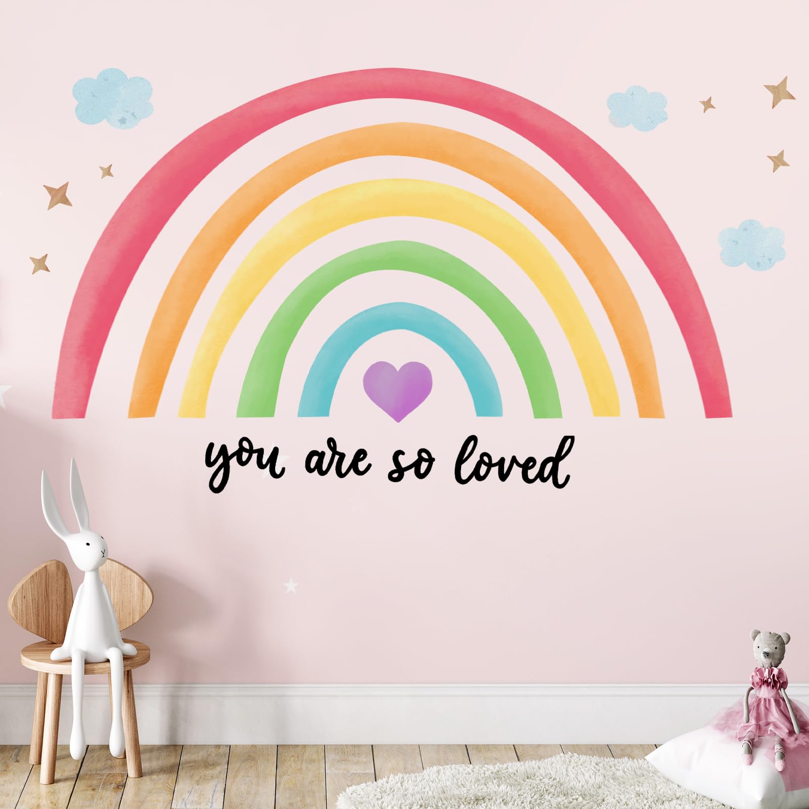 Rainbows wall decal: rainbow decor possesses many lovely elements, such as clouds, love, which is suitable for children; Each element can be arranged freely, which allows kids to use their imagination to create their own style, meanwhile this rainbow wall decals can be applied for adults too