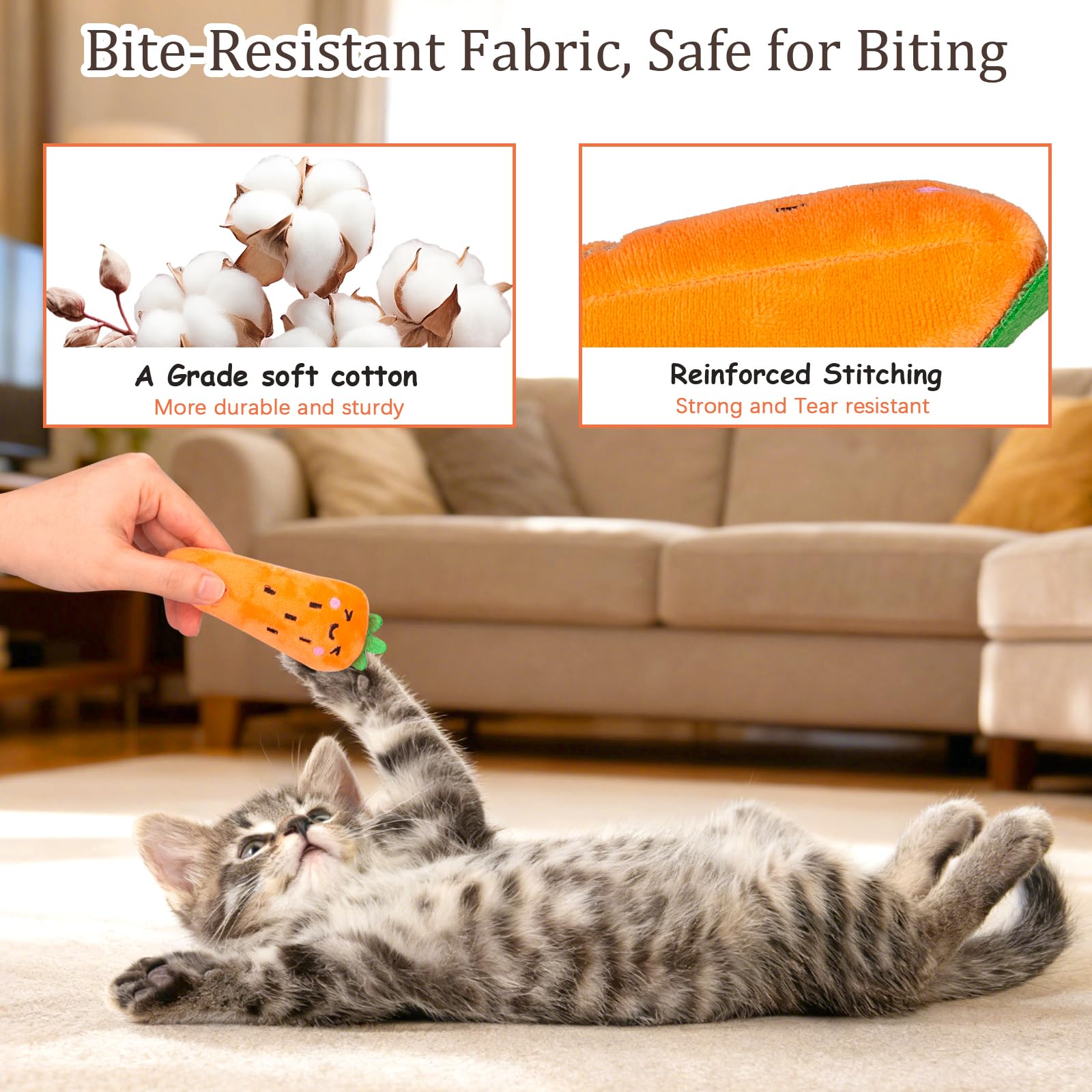 Soft, Durable & Safe to Bite: This kitty toy is made of upgraded soft cotton, thicker fabric and stronger stiching than any plush cat toys, and soft cotton for comfortable touch for cats without hurting gums and mouths. These cat bite toys are an essential addition to your cat's relief from boredom