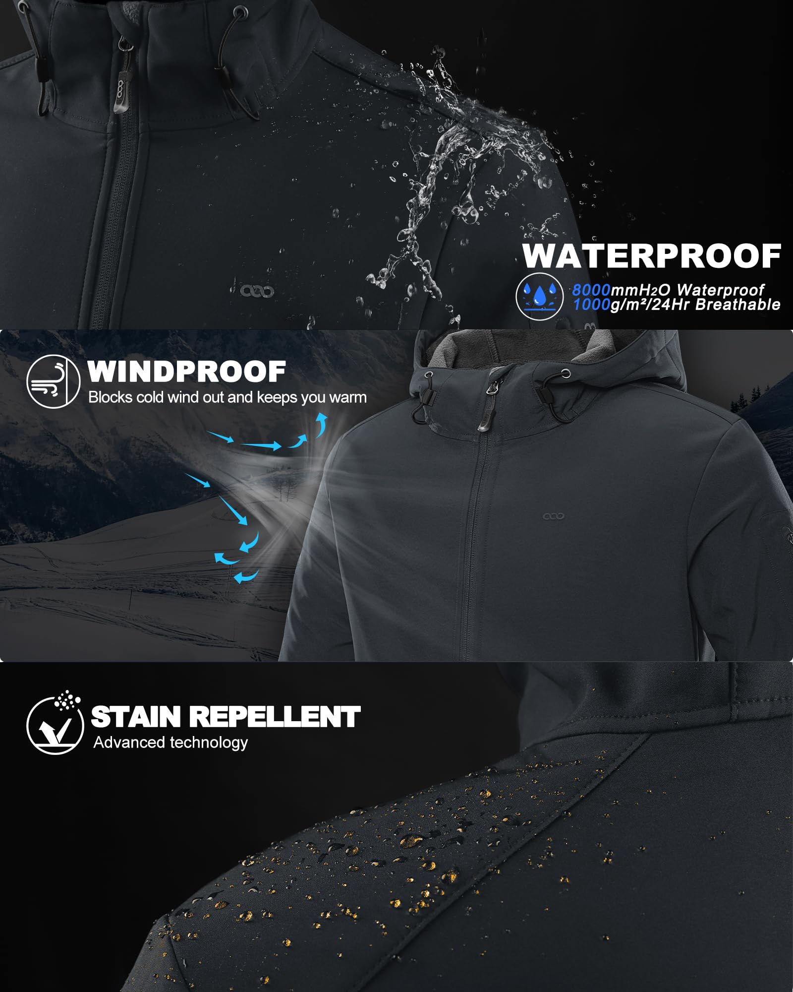 【WATERPROOF & BREATHABLE】33,000ft men's softshell jacket with hood features 3-layered material with outer soft shell, TPU membrane mid-layer and inner fleece lining to provide strong protection against the elements. Outer shell with DWR finish resists water, dirt and oil to keep you dry and clean. (8000MM fabric waterproofness rating, 1000G/M2/24hr fabric breathability rating)
