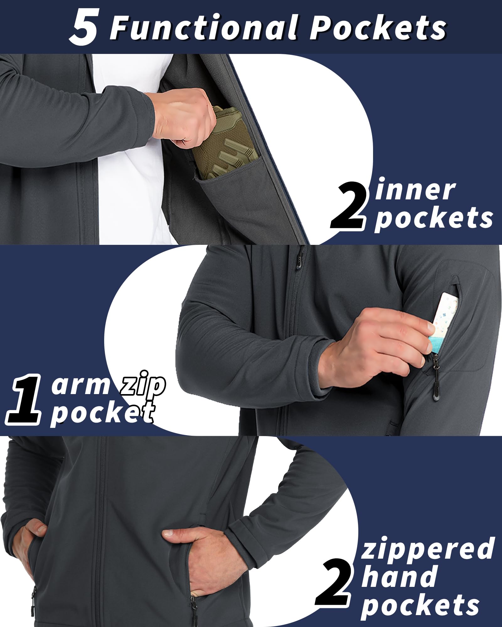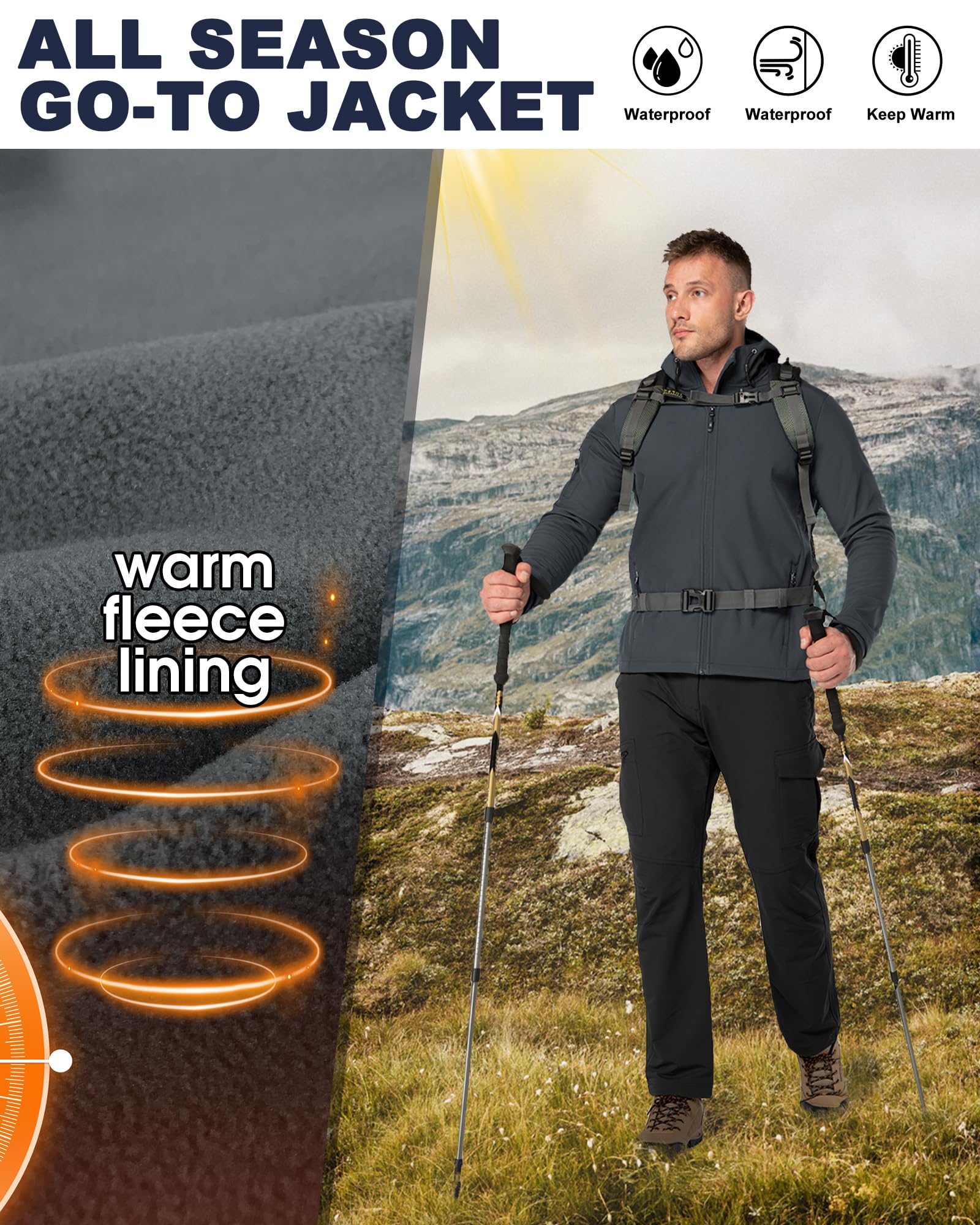 【WARM FLEECE LINED JACKET】33,000ft men's fleece lined soft shell jacket gives you additional thermal insulation and superior moisture-wicking performance. The brushed fleece lining is soft to the touch and keeps you comfortable and cozy.