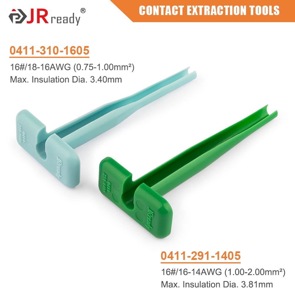 Terminal Pin Removal Tool: 2pcs blue pin removal tool (0411-310-1605) for wire size 16-20AWG and 2pcs green pin removal tool (0411-291-1405) for wire size 14-16AWG. The plastic options reduce the risk of damaging attached wires insulation, connector seals, or connector body ensuring a safer removal process.