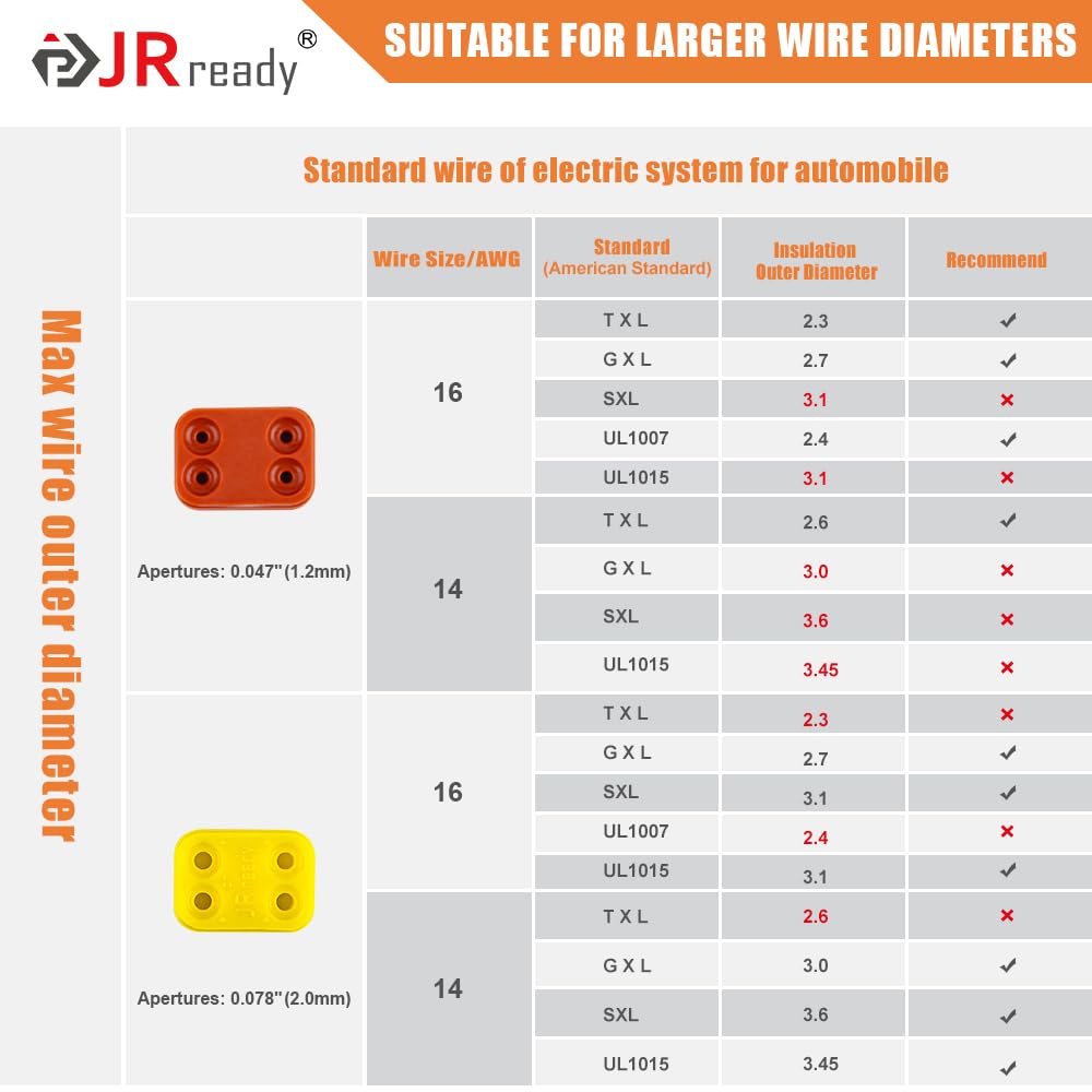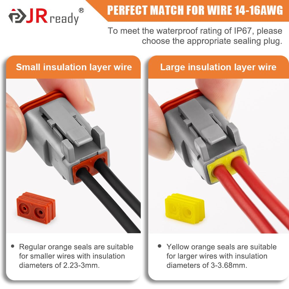 Enlarged Wire Seals for 14AWG: Compared to 16AWG, 14AWG wires have better redundancy for reliable electrical performance. we've developed several customized yellow waterproof seals (2 3 4 cavities) for 14AWG wires to ensure easy insertion. In various applications, you can swap the seal as needed, providing flexible maintenance for your electrical connections.