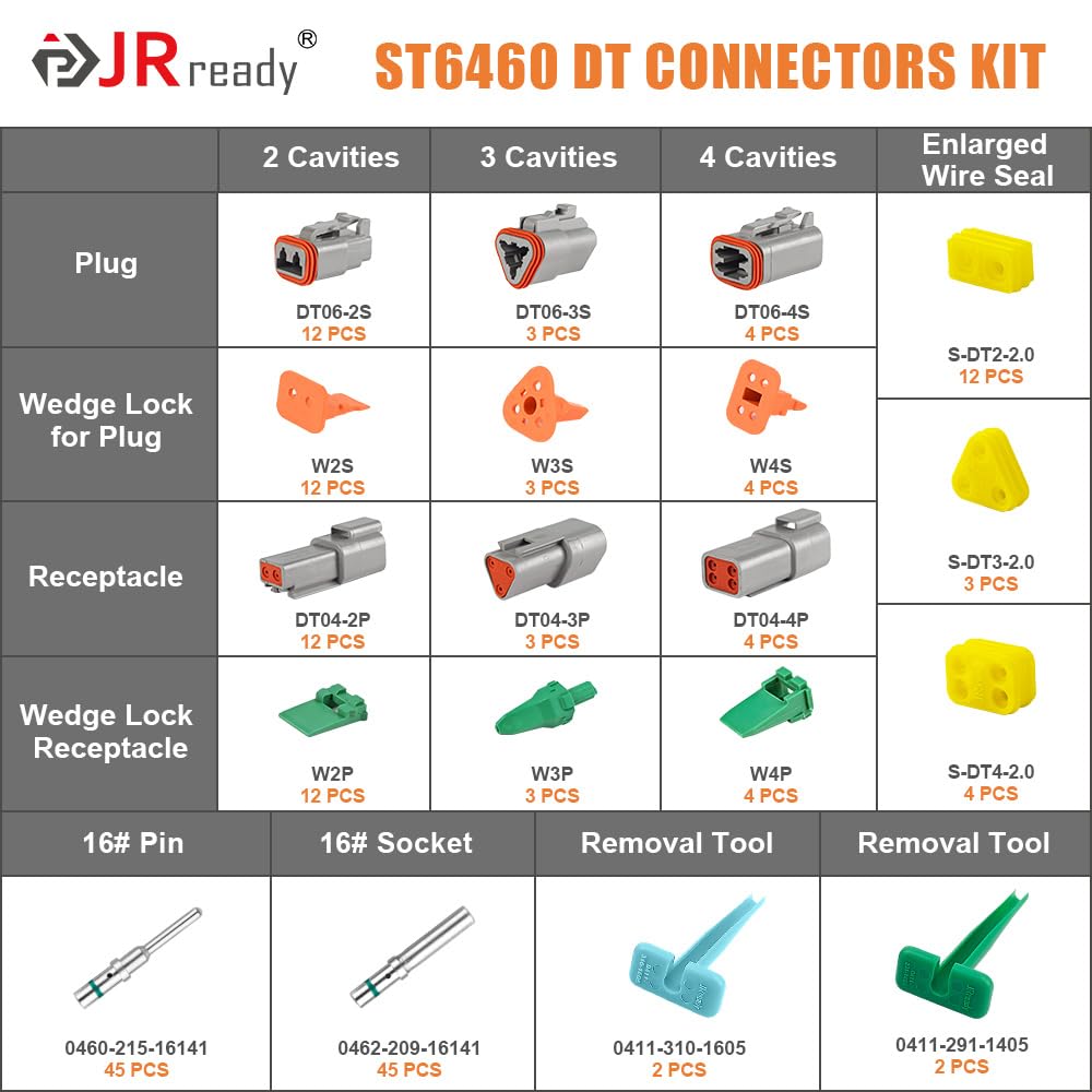 Deutsch 2 3 4 Connector Kit: 3 types of connectors and wedgelocks ranging from 2 to 4 cavities, size 16 pin/socket 14-18 AWG, 14AWG enlarged yellow rubber wire sealings, deutsch plastic pin removal tool.