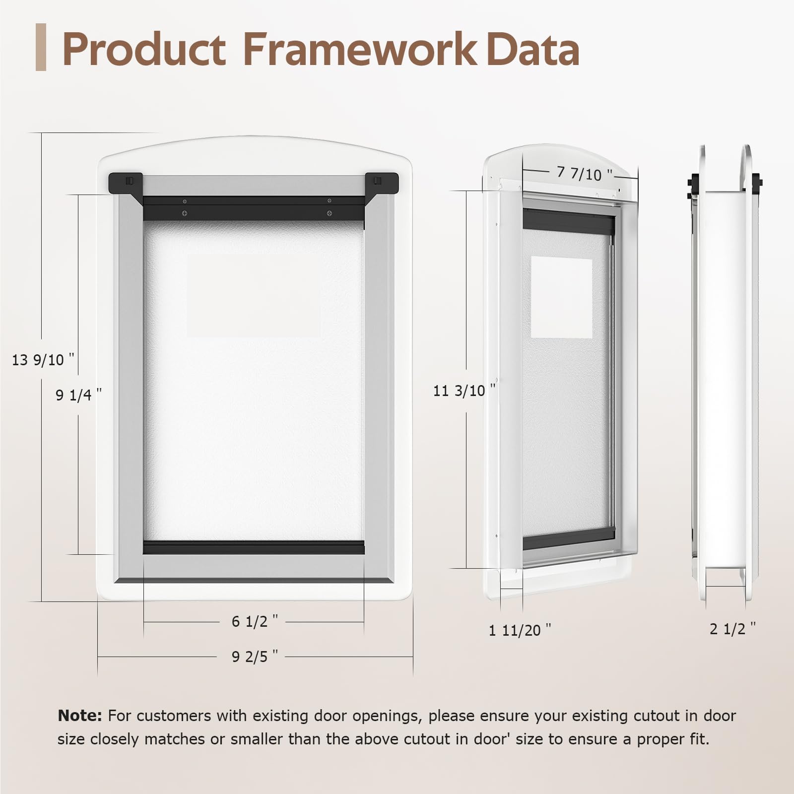 [Suitable for all kinds of dogs] The doogie dog door for dogs up to 40 pounds, telescoping(expanding) tunnel design can let dog door be installed in the doors of various thickness of 1.5"-3". Frame: 9 2/5"W * 13 9/10"H. Flap: 6 1/2"W * 9 1/4"H.