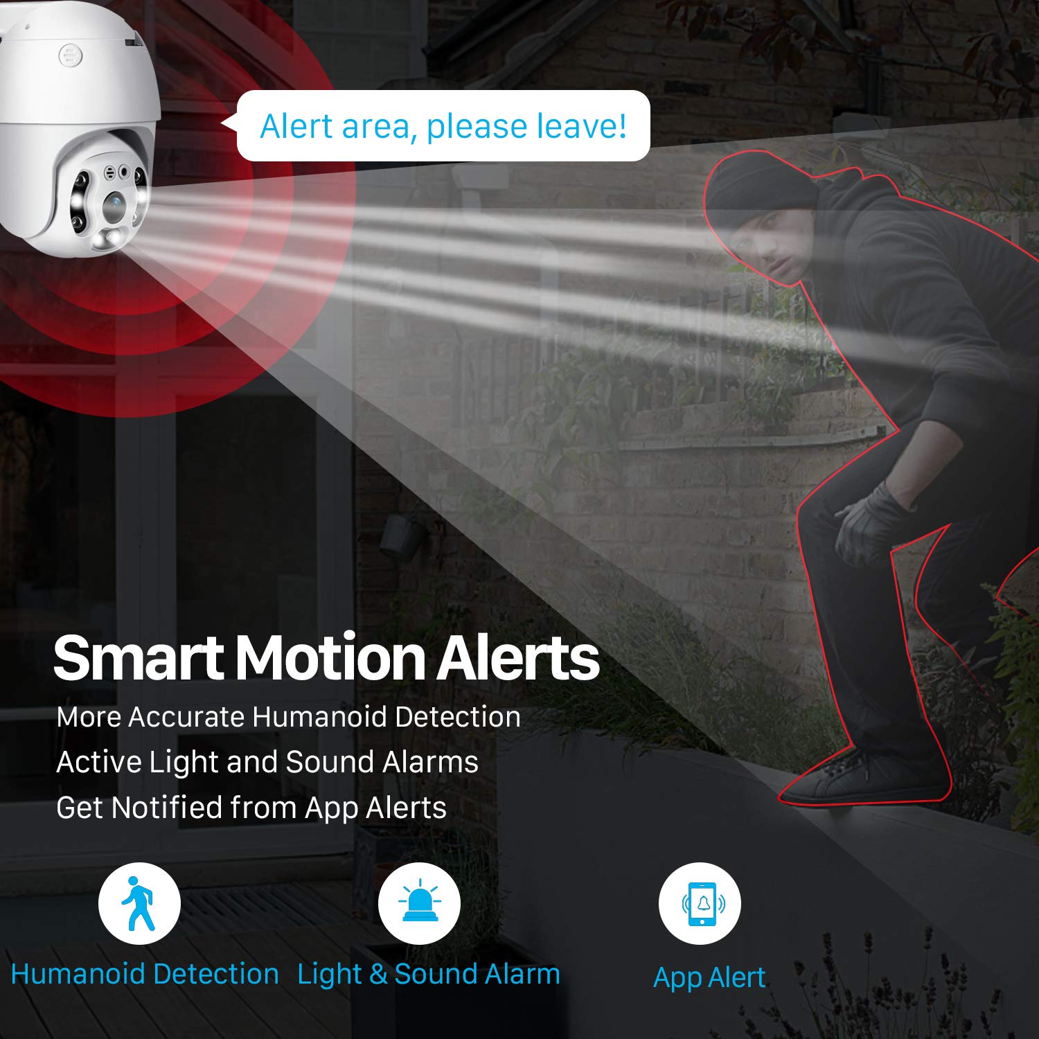 【Motion Detection & Alarms】 Want to warn uninvited guests? This outdoor security camera support customizable motion detection& remote viewing(iOS & Android), real-time and accurate movement alert with snapshot will be pushed to your phone, email & ftp server when motion detection is triggered. What's more, this camera will send double light vigilance & sound alarms when motion objects were detected.