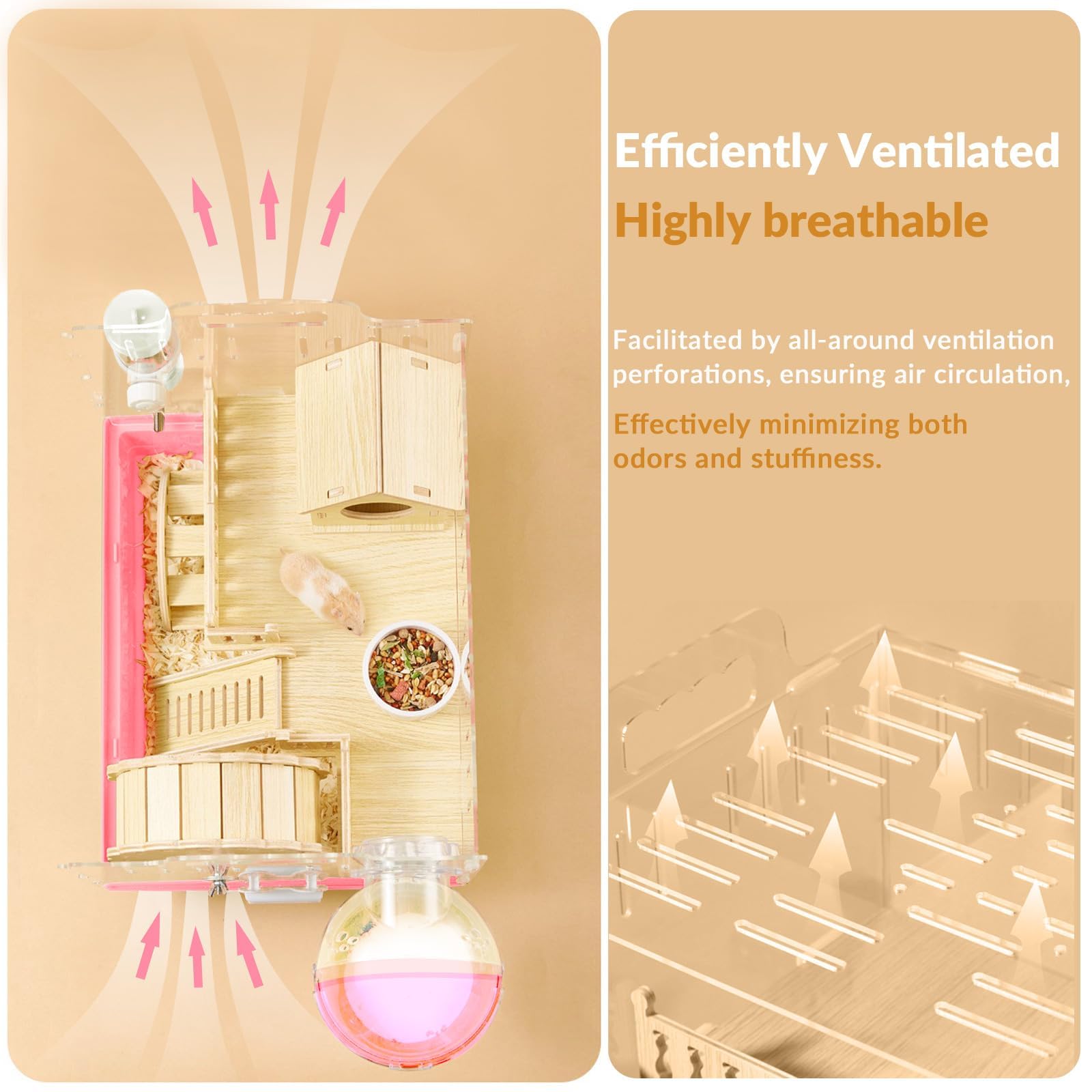 【See-through & Breathable】Peeling off the protective films on both acrylic sides ensures crystal-clear transparency for 24/7 hamster observation, while three-sided ventilation with <5mm micro-holes provides optimal airflow without escape risks.