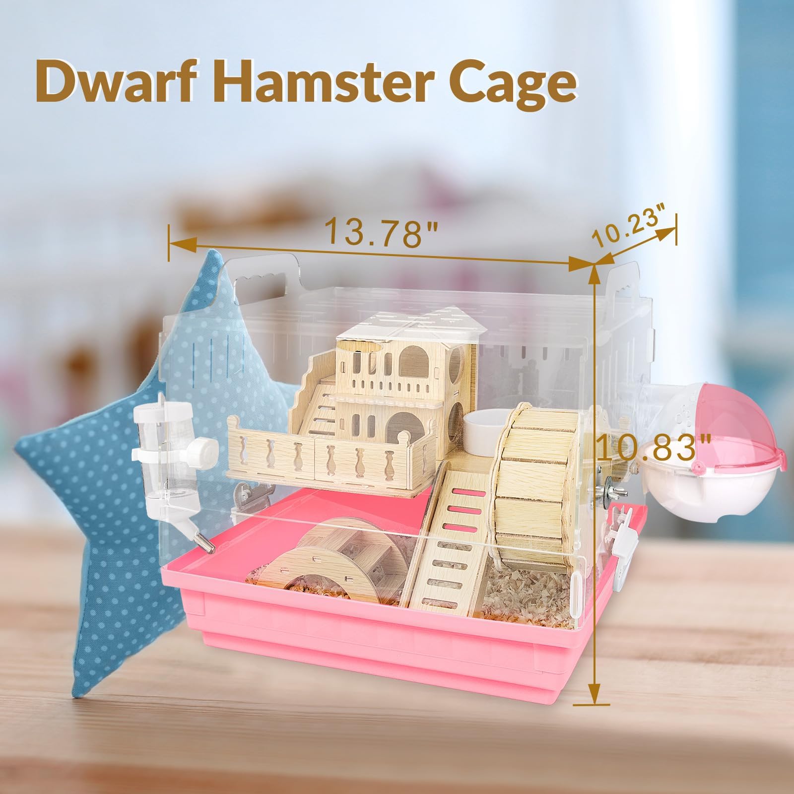 【Hamster Starter Kit】In addition to the cage, this set includes:A wooden hamster hideout for cozy nesting,A silent exercise wheel for nighttime runs,A dust/sand bath container for natural grooming,A drip-proof water bottle,A food dish, and An arched bridge toy for climbing fun.Everything you need to care for your hamster is covered—no extra purchases required!