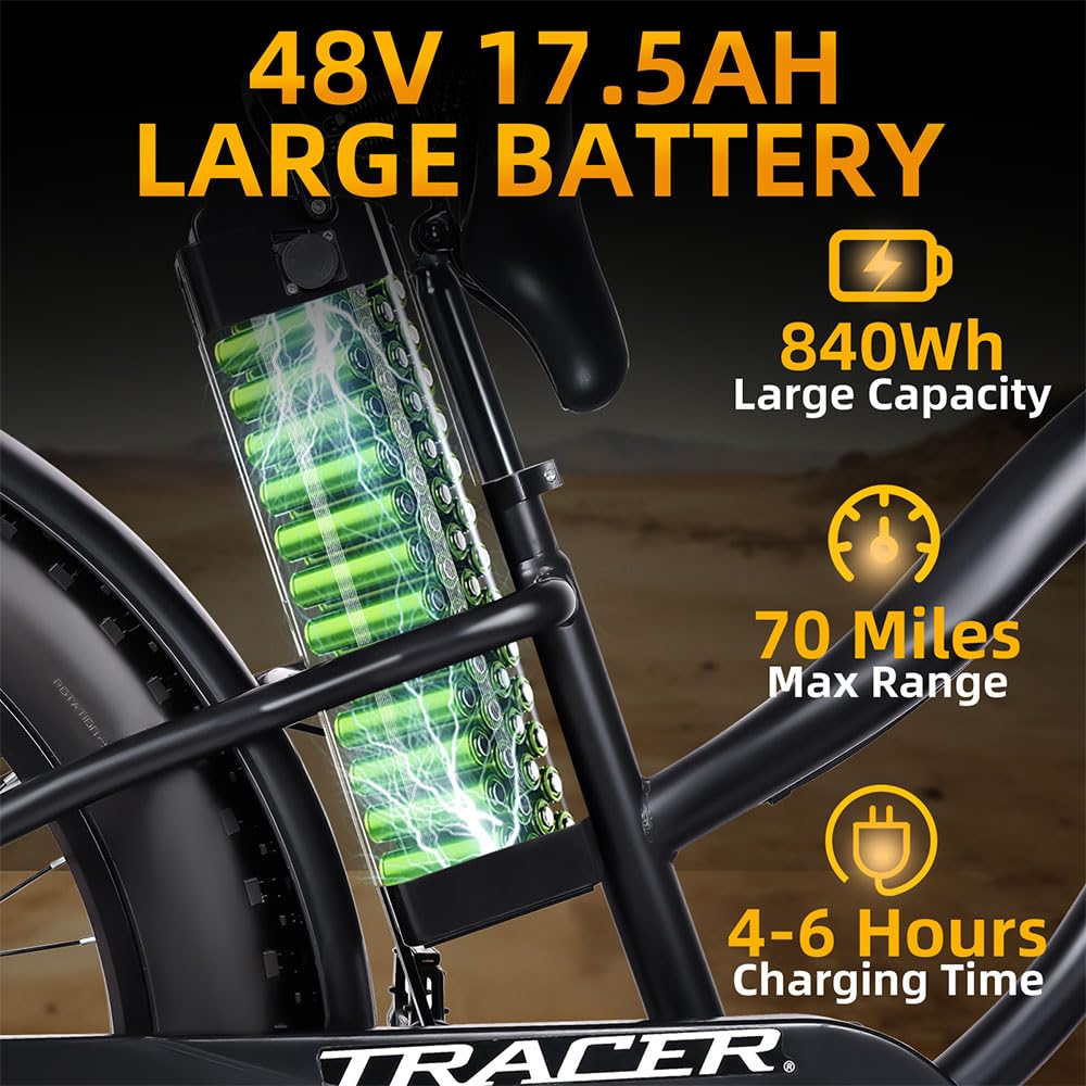 Extended Adventures: 48V/17.5Ah Panasonic battery for up to 30 miles of pure electric travel.