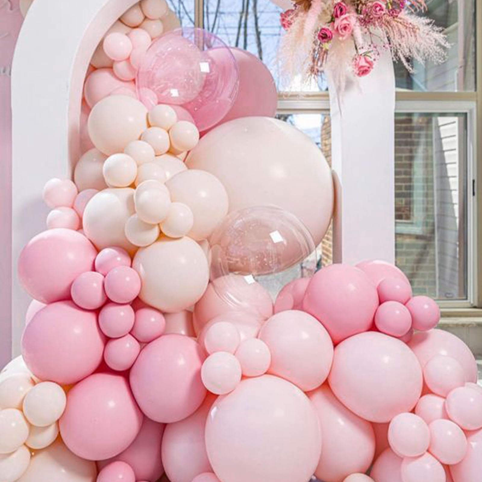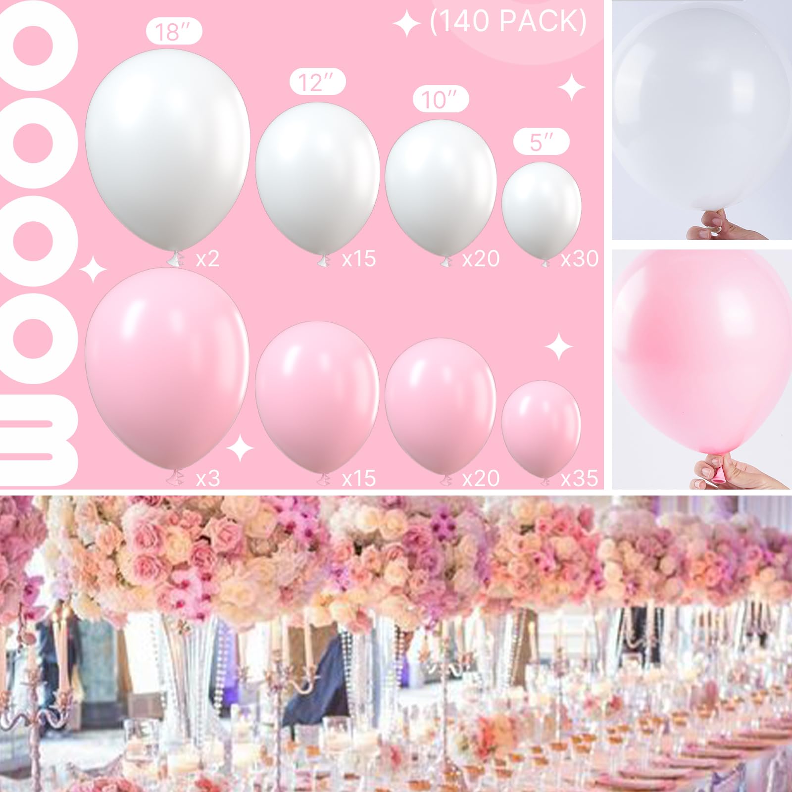140 PCS PASTEL PINK AND WHITE BALLOONS DIFFERENT SIZES: Package includes 18 inch balloons 5 pcs, 12 inch balloons 30 pcs, 10 inch balloons 40 pcs, 5 inch small balloons 65 pcs, balloon decorating strip included