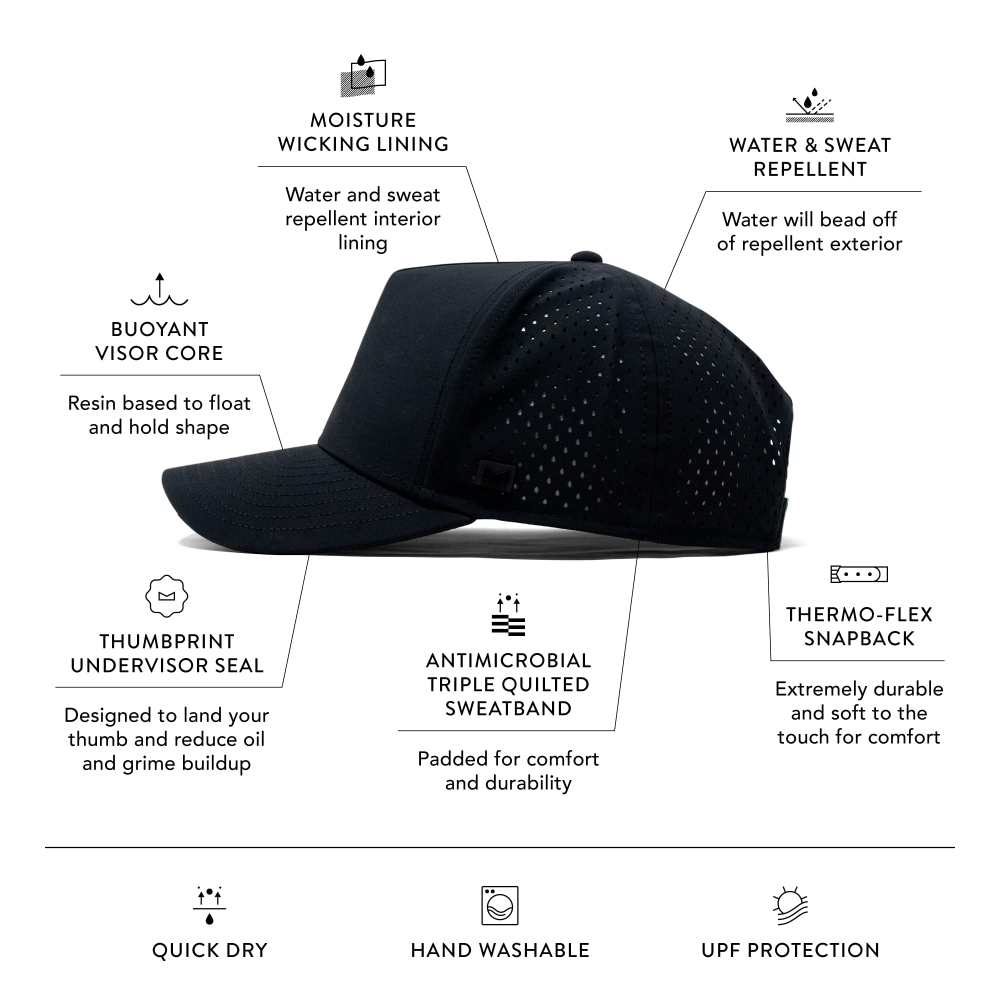 PERFORMANCE SNAPBACK HAT: Exterior crown has hydrophobic crown panels, laser-perforated side & rear panels for breathability, and custom soft touch snapback closure. Honeycomb Visor is designed for weight reduction and packability