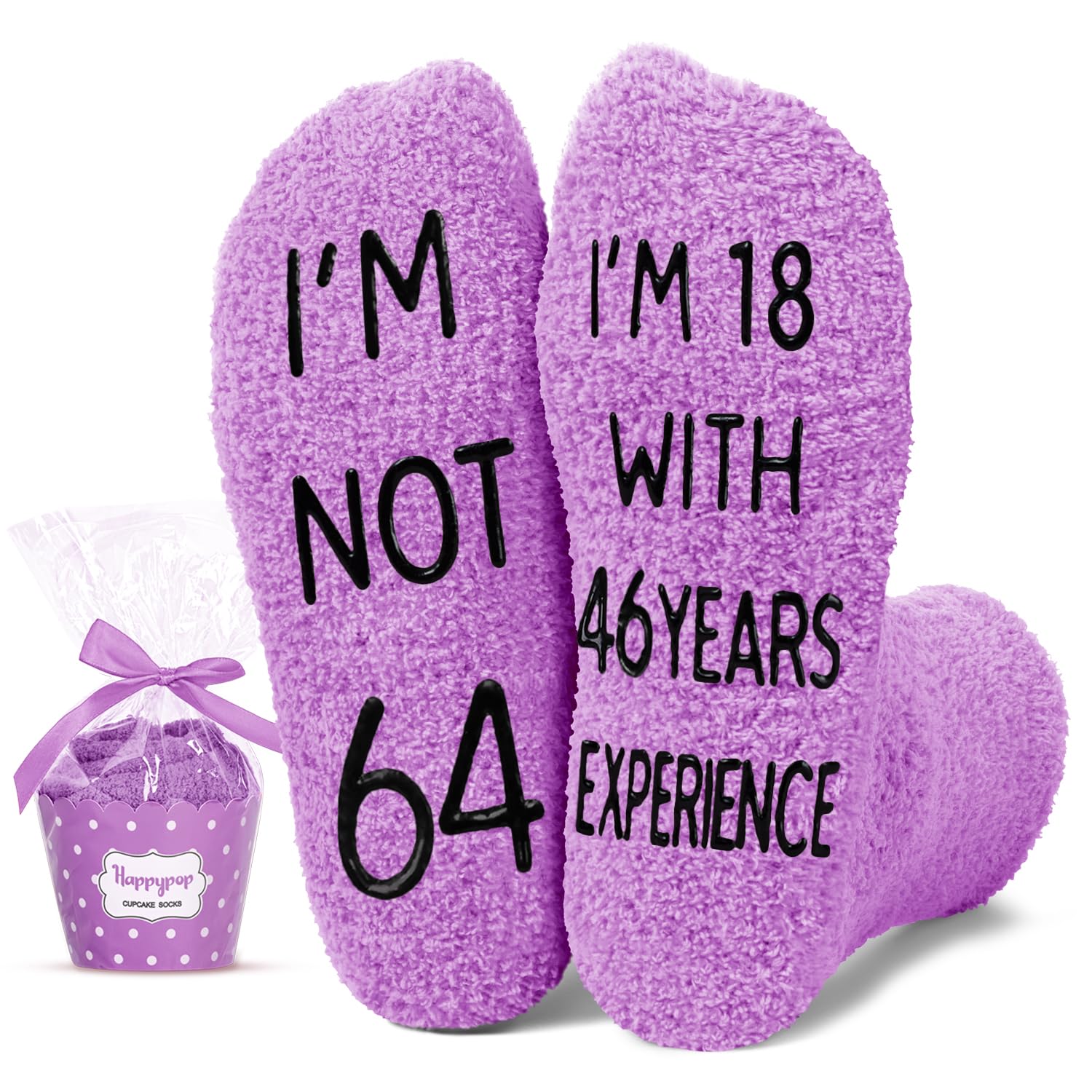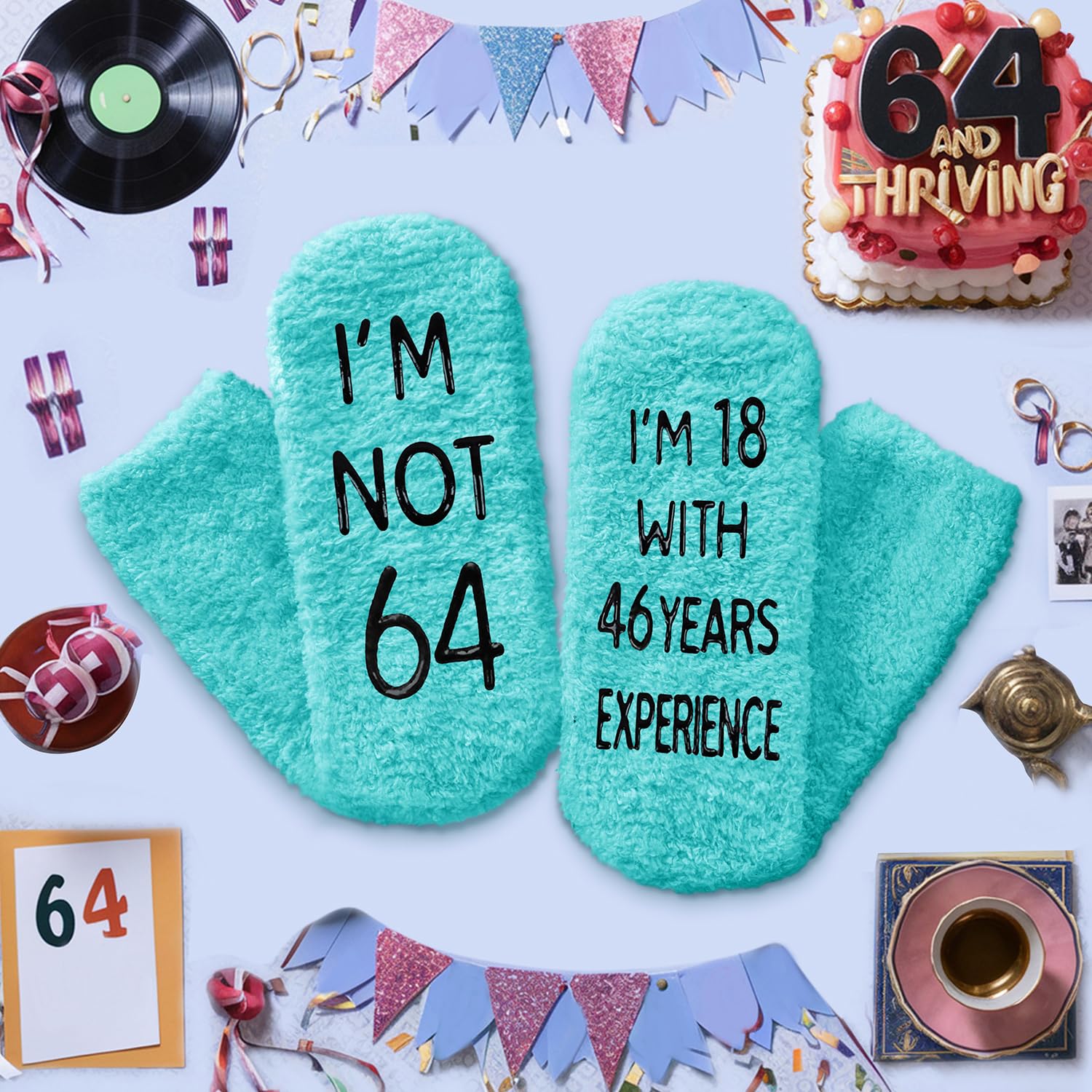 64th BIRTHDAY GIFT IDEAS: Celebrate birthday with our unique socks, humorously inscribed with "I'M NOT 64, I'M 18 WITH 46 YEARS EXPERIENCE."They make an ideal gift for Birthdays, Christmas, or White Elephant exchange.