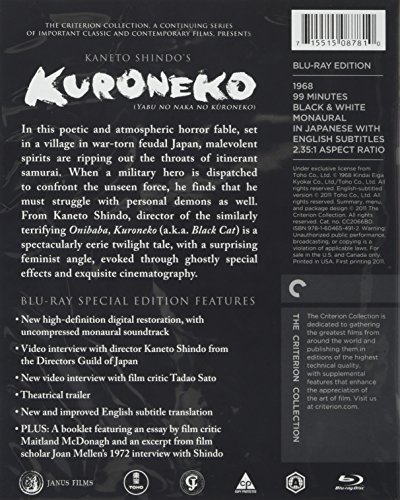 In this poetic and atmospheric horror fable, set in a village in war-torn medieval Japan, a malevolent spirit has been ripping out the throats of itinerant samurai. When a military hero is sent to dispatch the unseen force, he finds that he must struggle with his own personal demons as well. From Kaneto Shindo, director of the terror classic Onibaba, Kuroneko (Black Cat) is a spectacularly eerie twilight tale with a shocking feminist angle, evoked through ghostly special effects and exquisite cinematography.