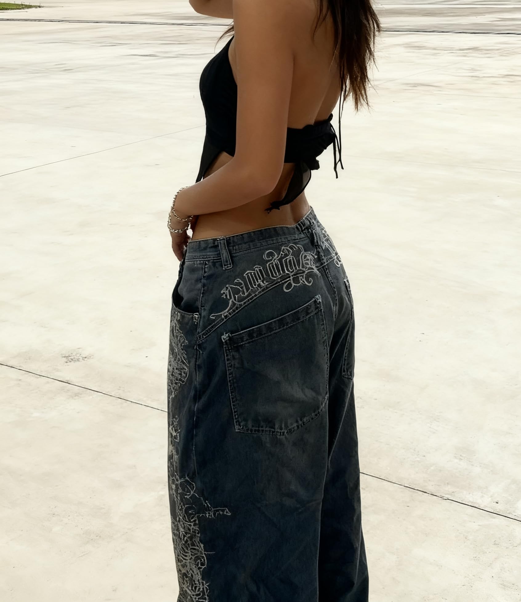 Gothic Print Baggy Jeans – Add an edgy touch to your outfit with these gothic print jeans.