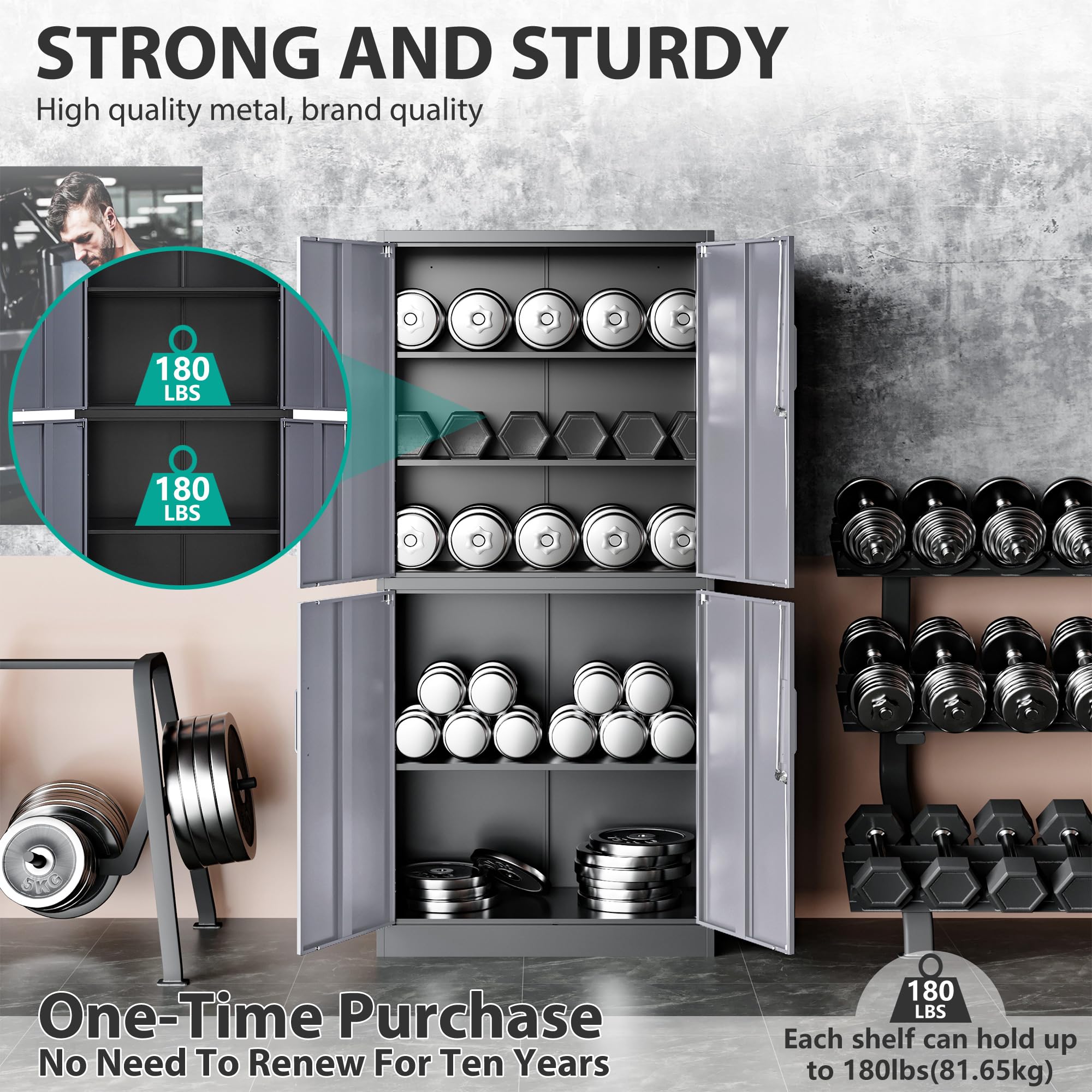 【Door with Magnets】 4 door locker design, high-grade lock, can secure valuables, and can also be mounted on the wall, so you can use the garage cabinets as home gym storage,garage storage cabinets, bathroom storage cabinet, office storage,kitchen storage cabinets,outdoor storage cabinet,cabinet, tool storage cabinet use