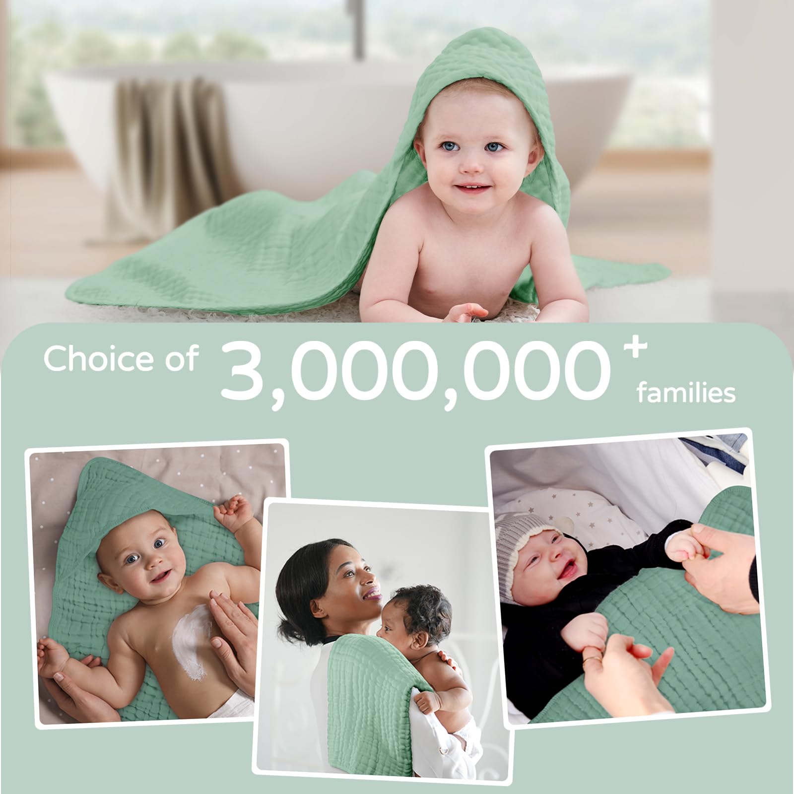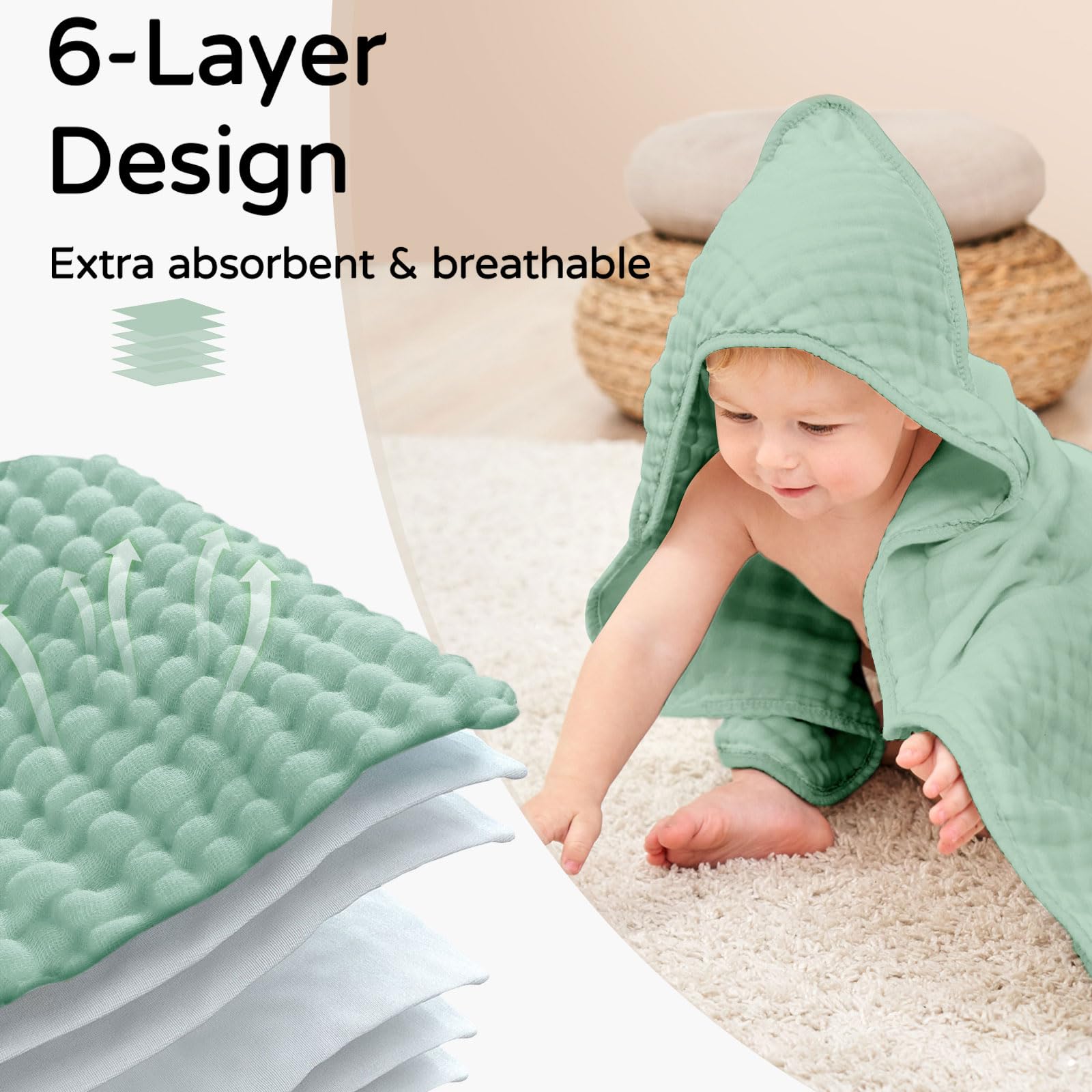 [Excellent Durability] - The 6 layers thickness muslin design is long-lasting enough for everyday use. Sized in 32 x 32 inches, the hooded baby towels are suitable for newborns, infants, toddlers, and small kids up to 3 years old.
