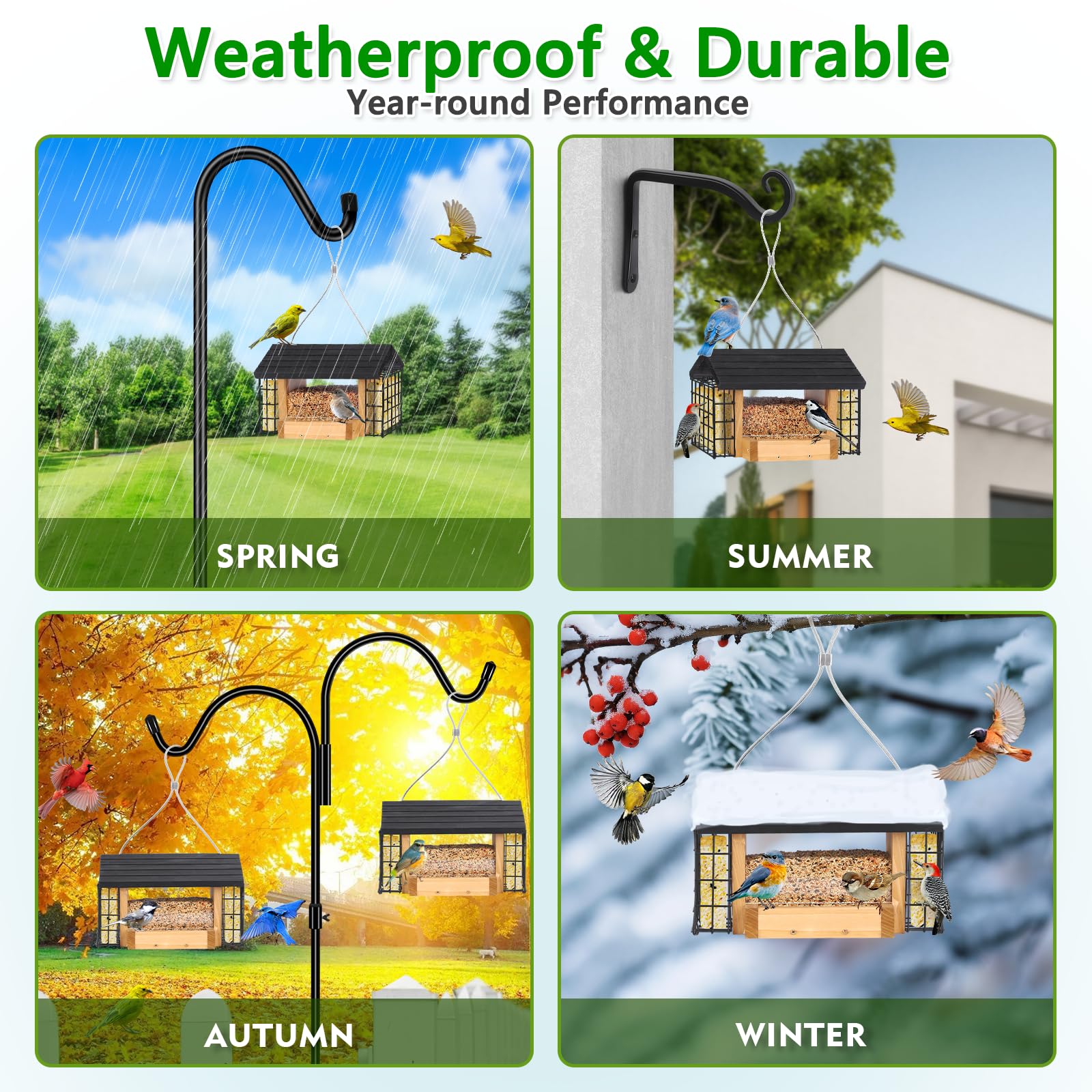 【Durable All-Weather Design】Designed for outdoor use, this hopper bird feeder features a weather-resistant roof and drainage holes at the bottom to keep birdseed fresh and dry. Built to withstand rain, wind, snow, and sun, it’s ideal for year-round outdoor use. A built-in perch provides birds with a secure foothold while feeding, ensuring comfort in all seasons.