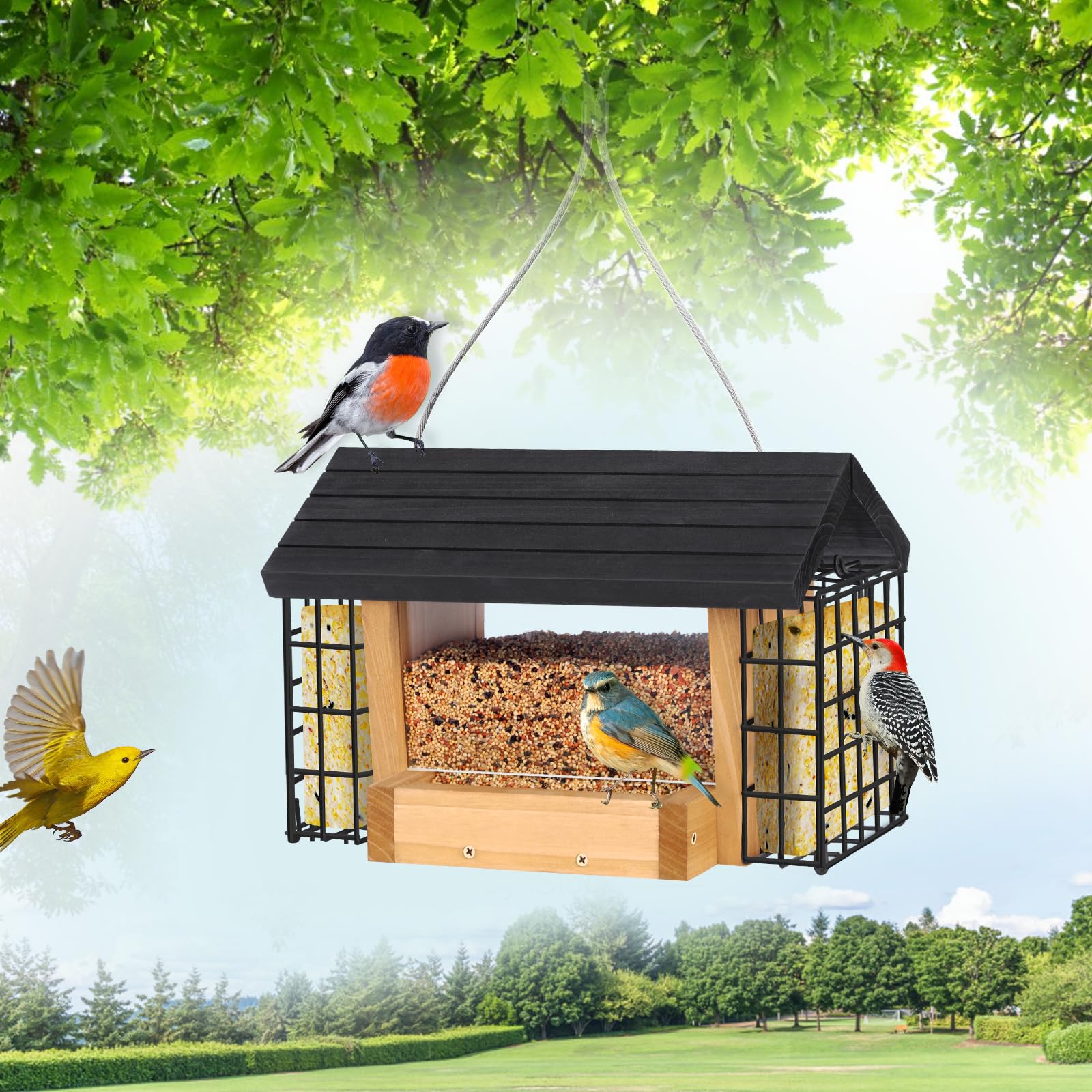 【Large Capacity Hopper & Dual Suet Cages】This cedar wood bird feeder for outdoors holds at least 2.8 lbs of mixed seeds in the central hopper, plus two side suet cages with secure latches to help deter squirrels. The double cages can also hold suet, fruit, bread, or nesting materials, attracting a wider variety of birds to your outdoor space.