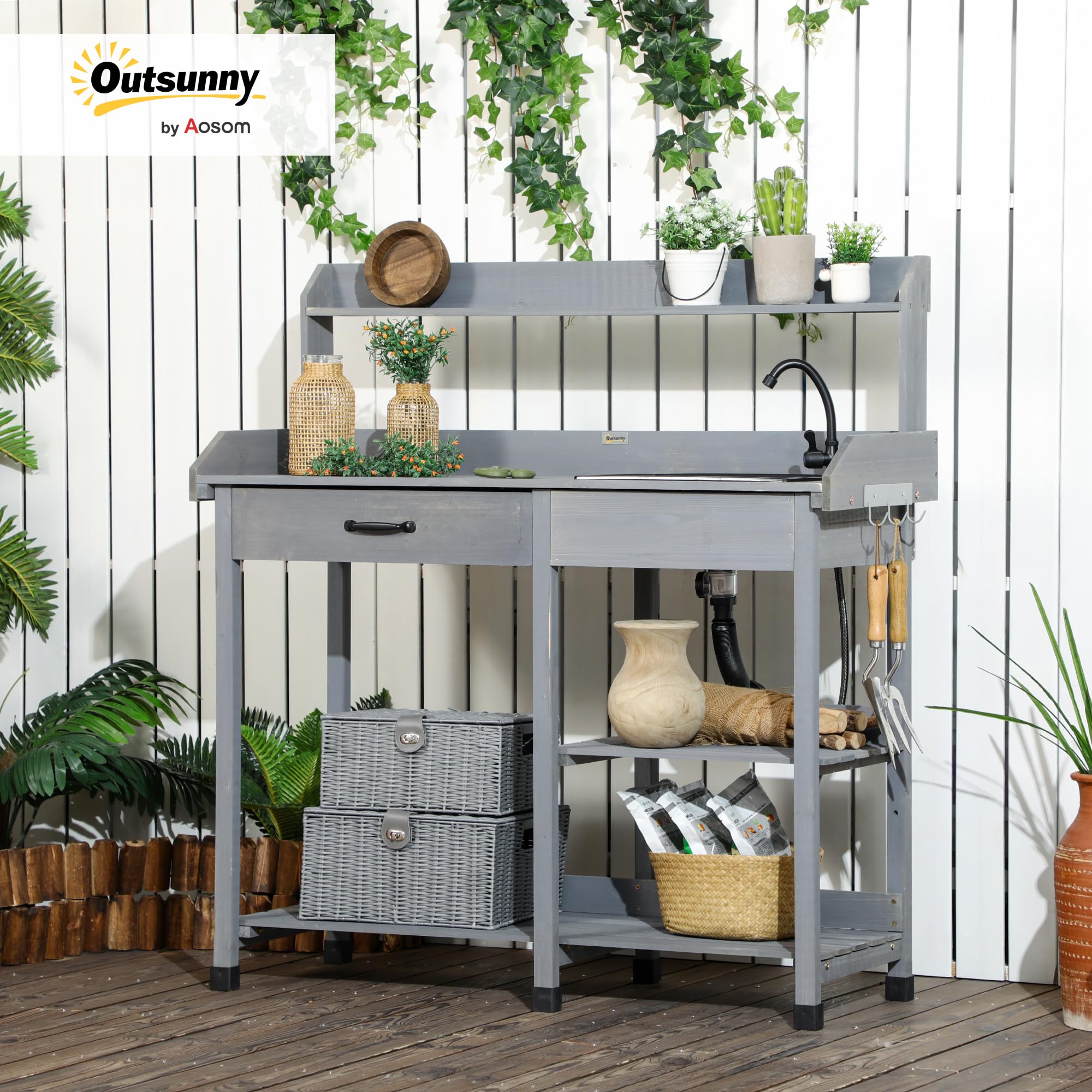 Extra Storage: Our garden work table provides various outdoor storage spaces. Down below, you can find a large shelf that's excellent for bags of soil; below the sink, you have a place for seeds. Hooks keep garden tools close at hand and offer a space for gloves, and a drawer lets you keep belongings covered and out of the rain.