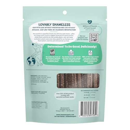 Doggy Dental Sticks: Help keep your pup’s pearly whites clean and their breath fresh with these Shameless Pets Mighty Mint Dental Sticks. We made our dental treats with ridges in order to deep clean teeth, and we’ve added key upcycled ingredients to support your pup’s total health. Includes one 7.2 ounce bag, so you have enough to keep those pearly whites clean.