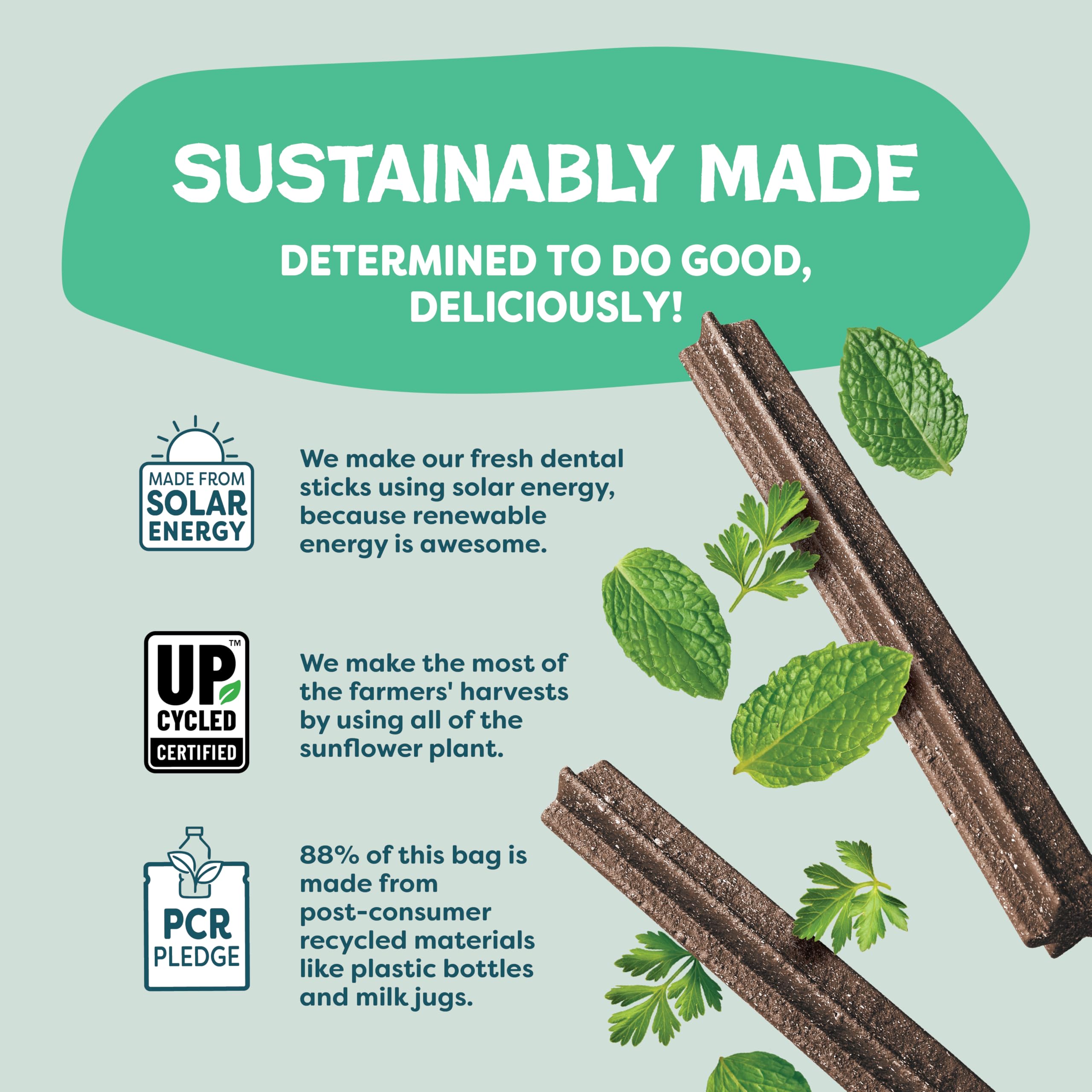 Delicious dental treats with health benefits such as fresh breath support, not filled with fillers and sustainably made in the USA. Customers praise the treats for their nice toughness, pleasant smell, and effectiveness in freshening breath.