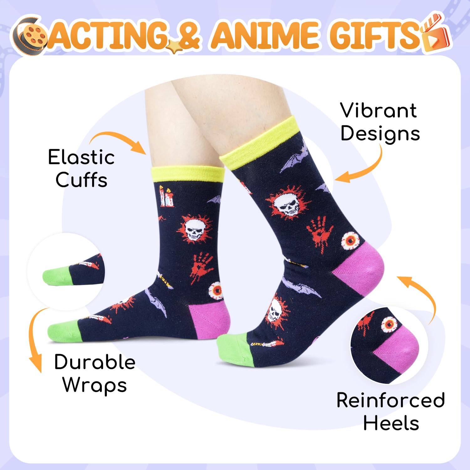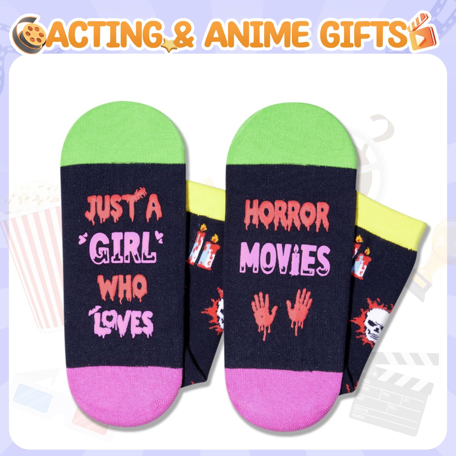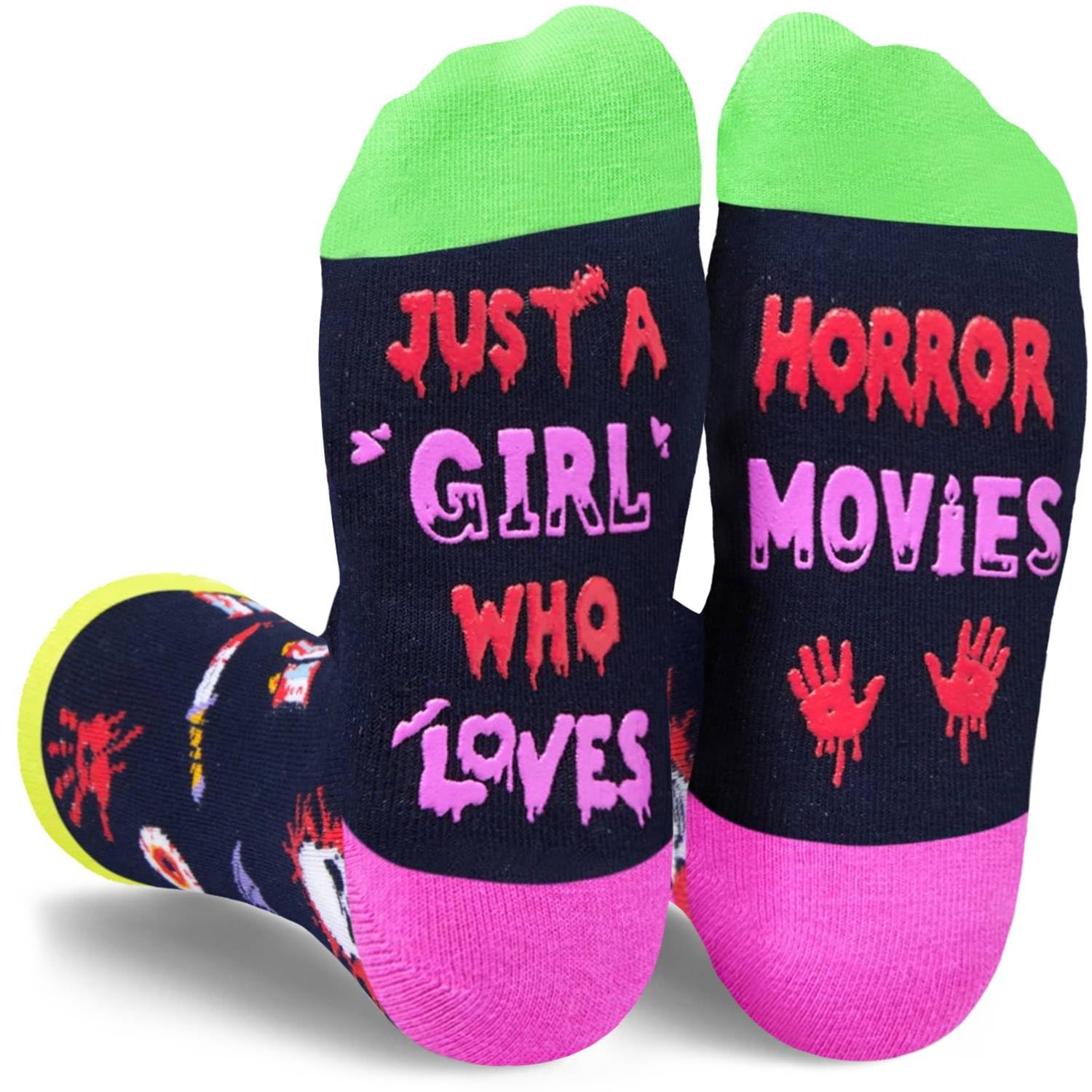 HORROR MOVIE SOCKS: These scary socks feature a funny saying"JUST A GIRL WHO LOVES HORROR MOVIE". The design featuring chilling elements like candles, daggers, skulls, eyeballs and bloody palm prints, sketch out the thrilling horror atmosphere.