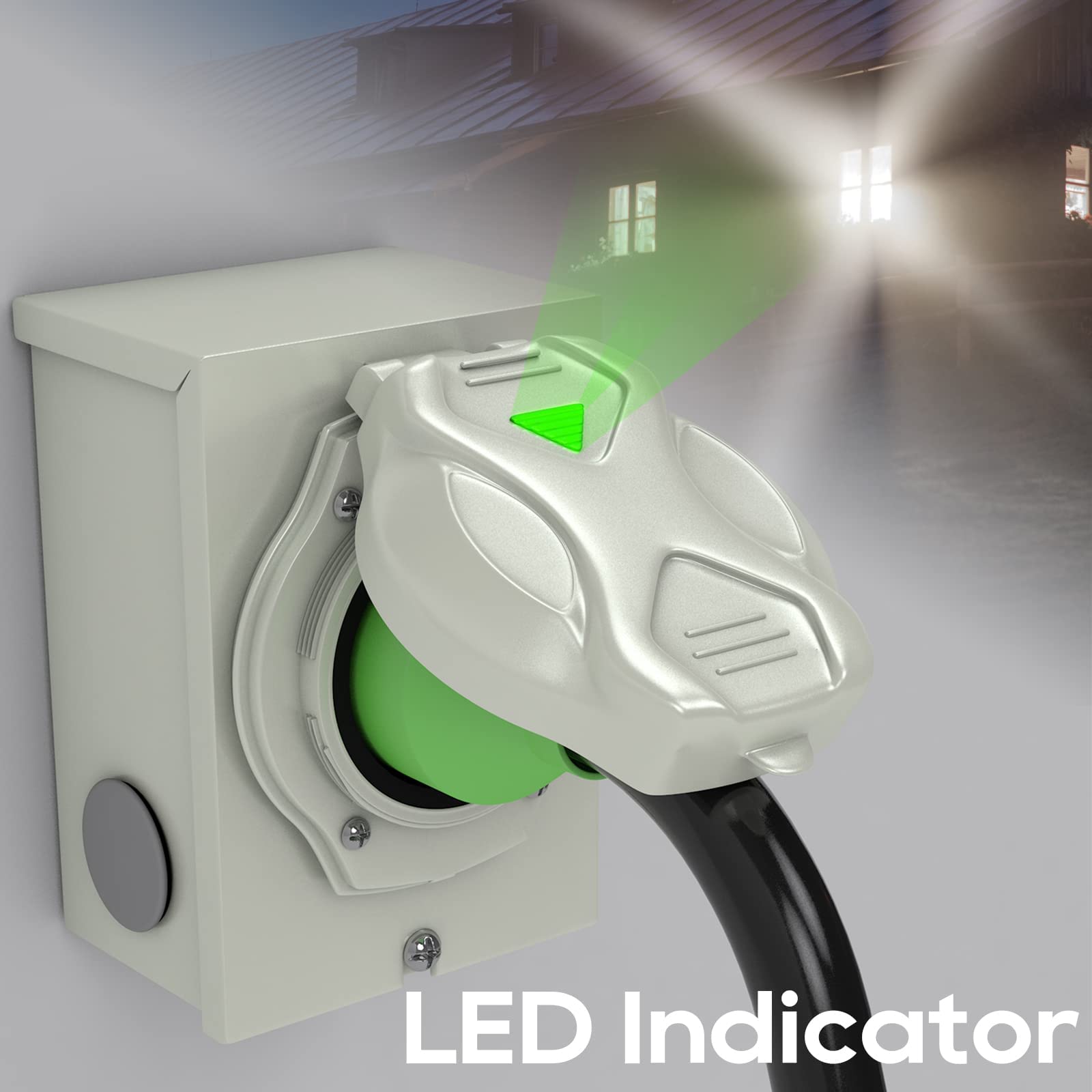 Use with Ease: The twist locking ring on the female plug of the 50-amp generator cord helps to keep dust and rain out of plug connection while the ergonomic finger grip on the male plug makes it easier for you to plug and unplug. Besides, there is a green indicator light on the cap of the generator inlet box, which is easy for you to tell when the power is on.