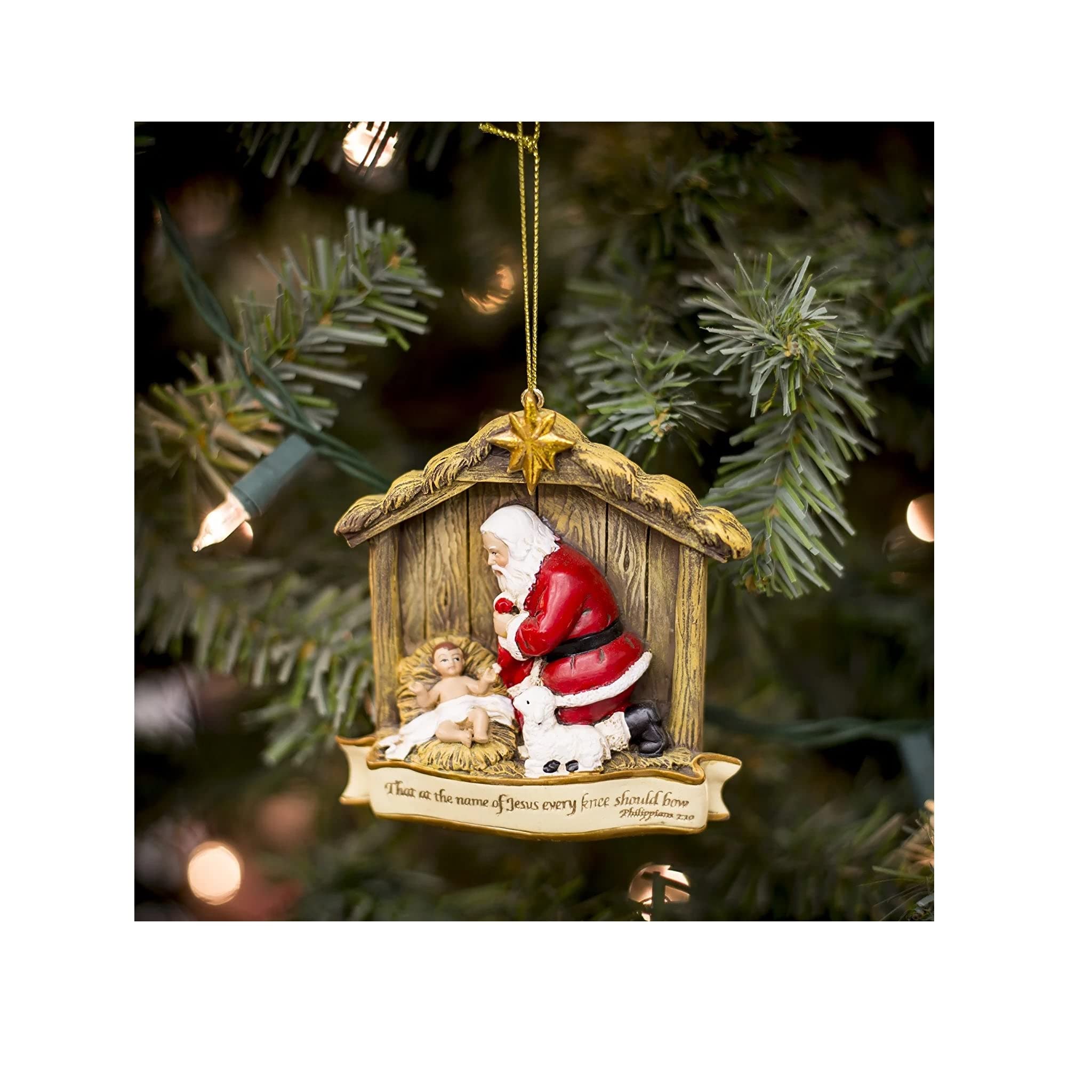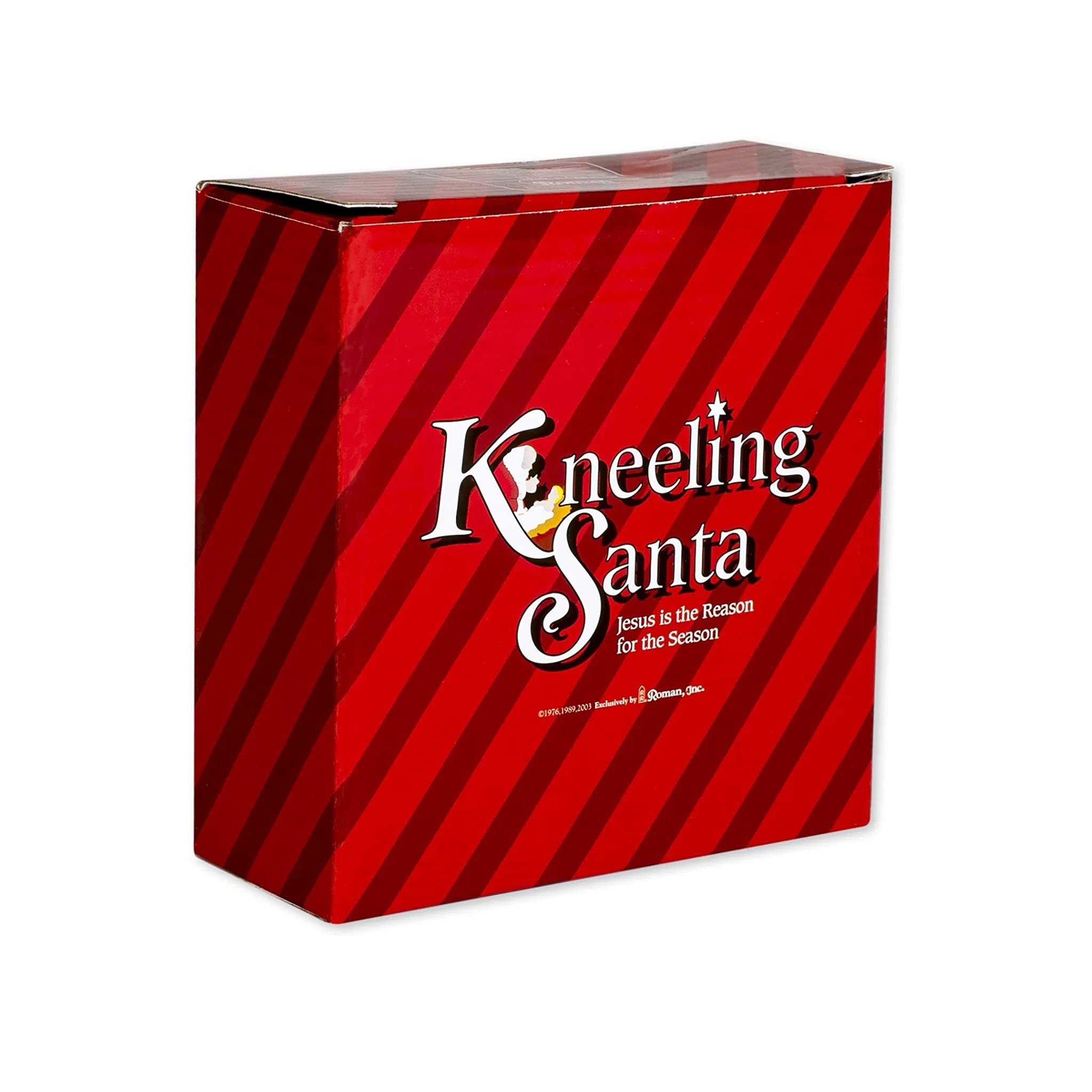 Kneeling Santa with Baby Jesus Ornament. Made from a resin and stone mix. Approximately 3.5 inches tall (9cm). Includes original manufacturers box and packaging. Made by Joseph Studio.
