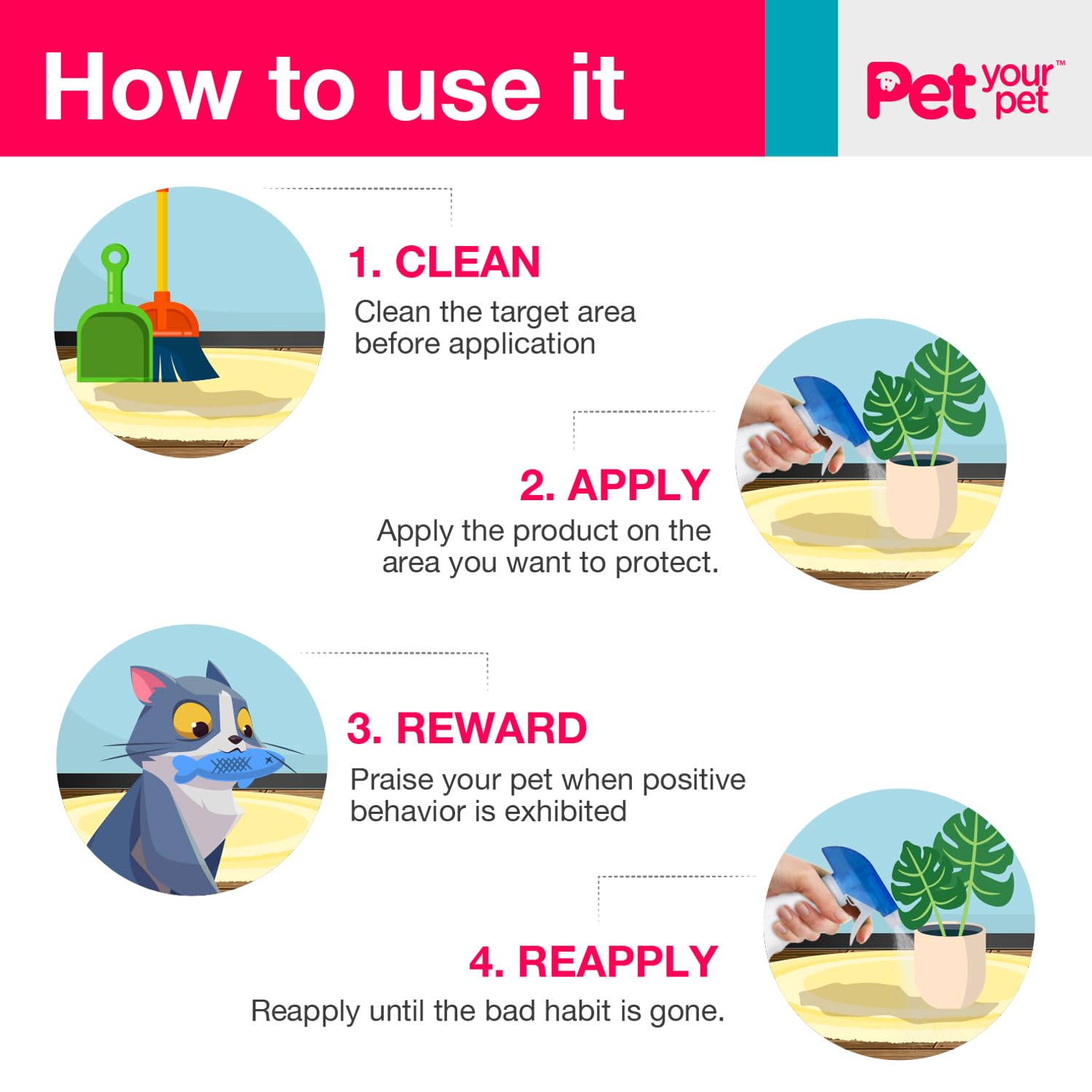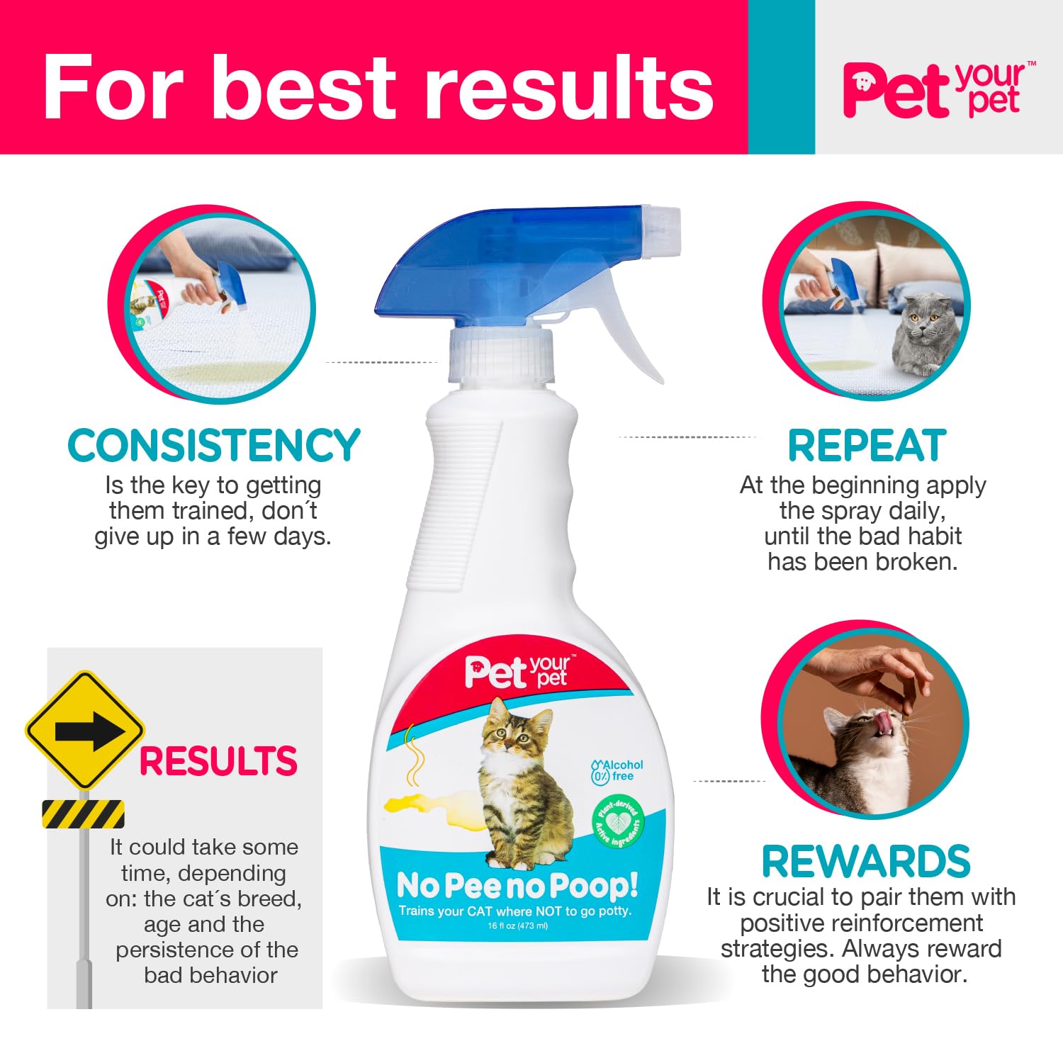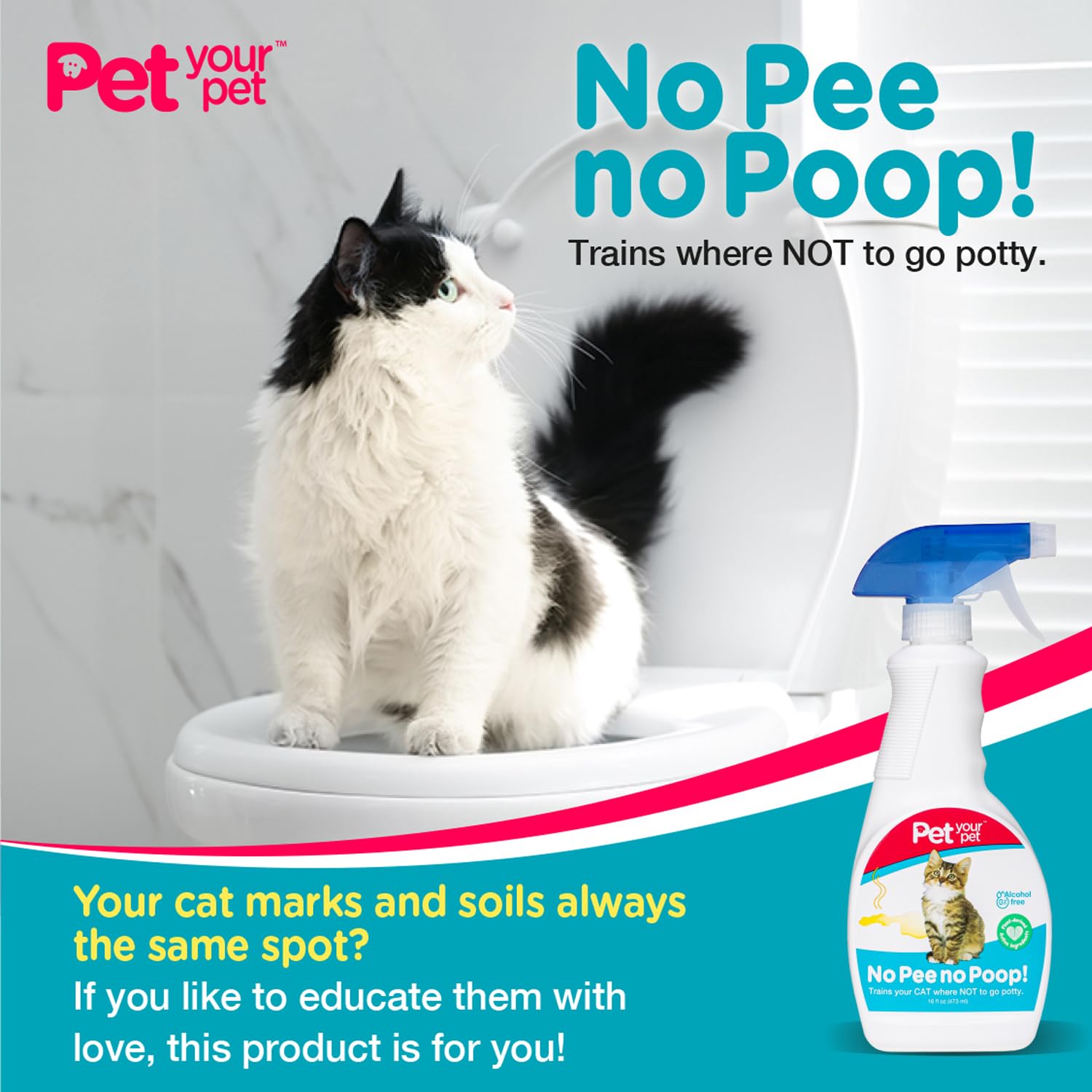 NO PEE, NO POOP! Our simple and effective cat training spray teaches your cat where NOT to go potty; just a few sprays on the desired area prevents pets from remarking or re-soiling to break bad habits.
