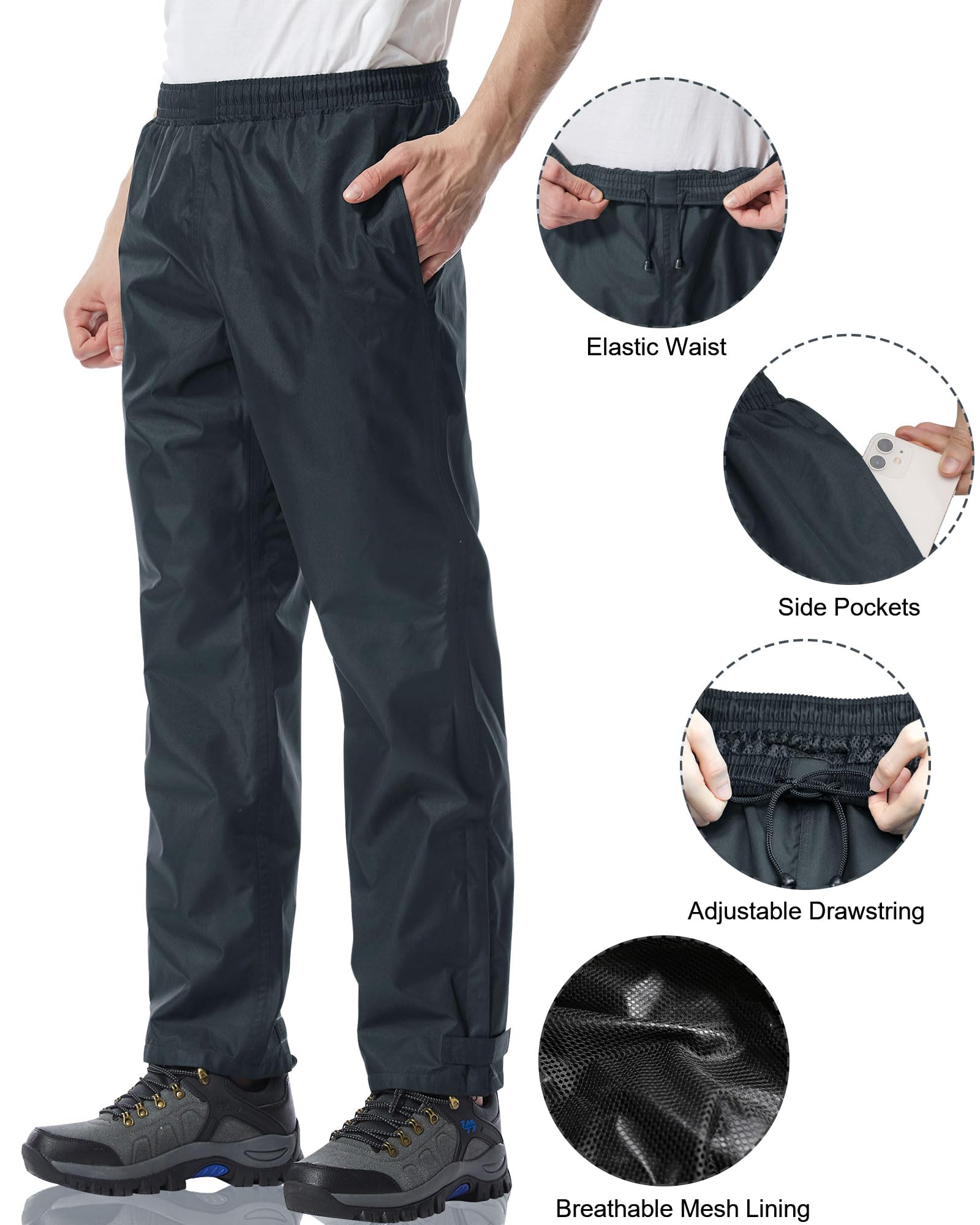 Waterproof Fabric: 100% Waterproof and windproof, keeps you dry in the rain. Waterproof rating: 5000mm. iCreek men's rain pants are made of premium nano polyester waterproof fabric, it is waterproof, soft, comfortable, etc