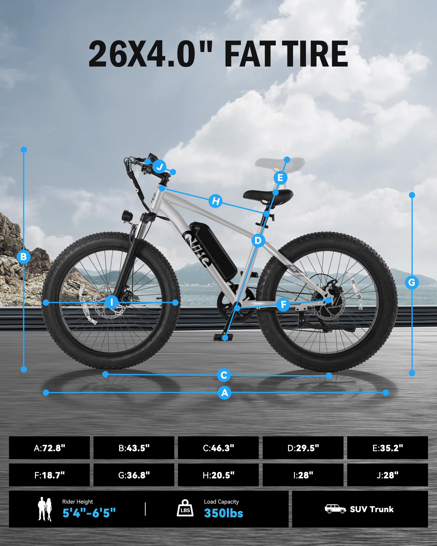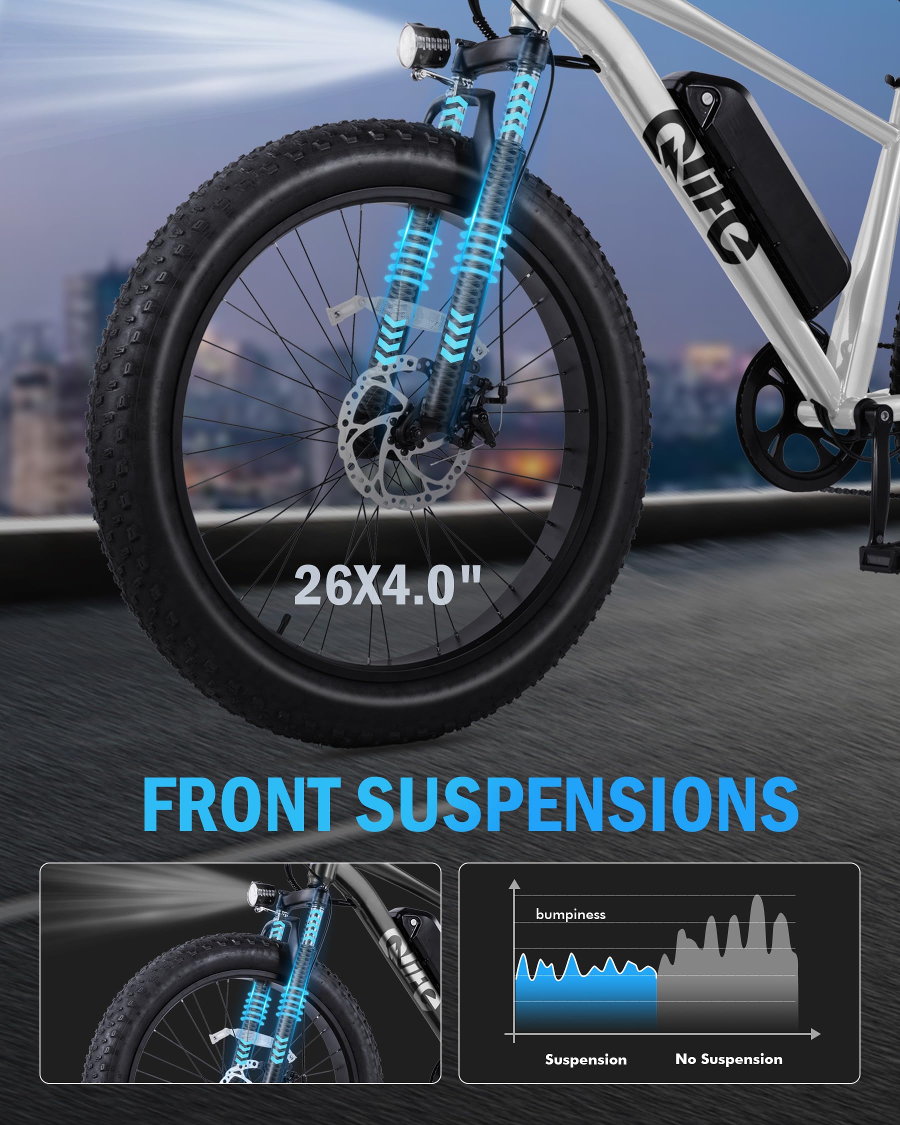 【Master all terrains with 4.0" Fat Tires】The 26-inch fat tires with 4.0 inch width support superior traction and stability on sand, snow, gravel, or rocky terrain. Combined with enhanced lockable dual shock absorber and dual disc brakes, this e-bike ensures a smooth, bump-free experience on any surface, deliver optimal durability and safety