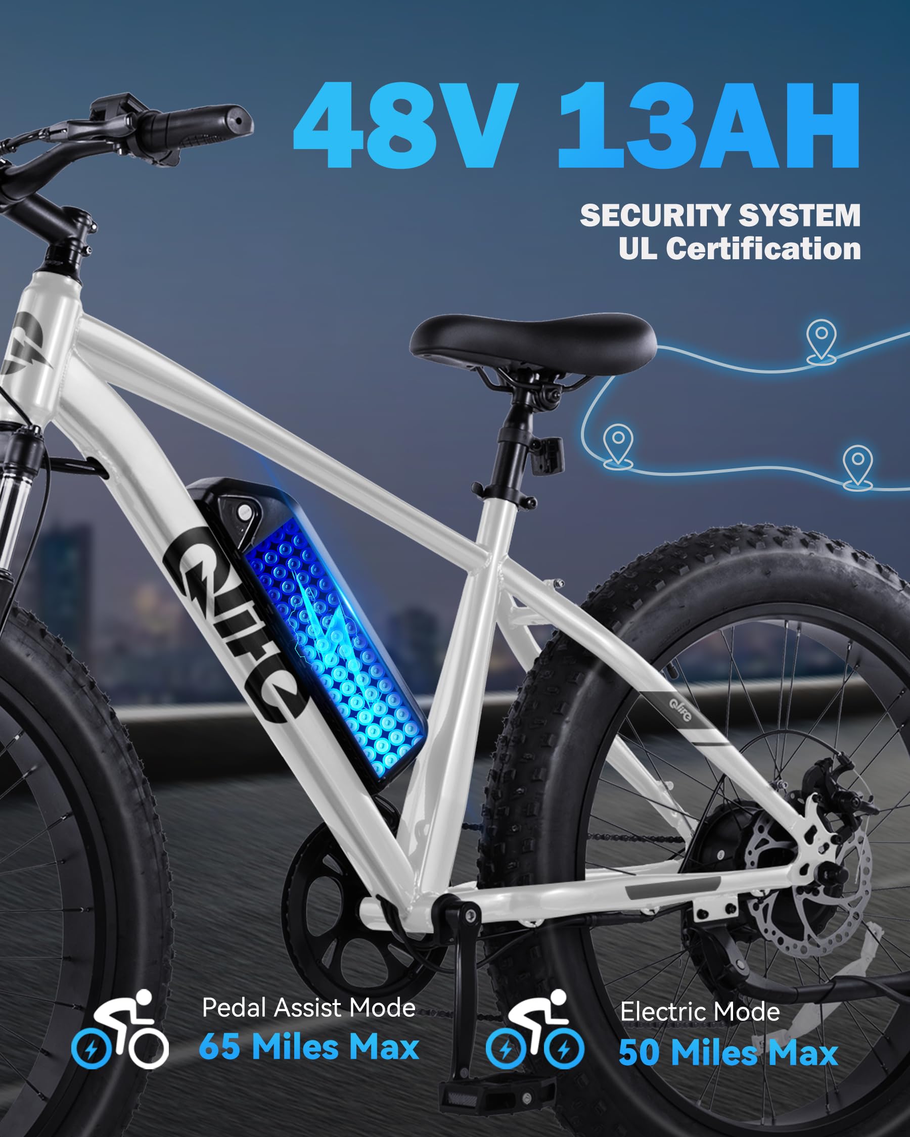 【Long Range 48V 624Wh Battery】Powered by a 48V 13AH waterproof Li-ion battery, the ebike offers up to 65 miles on PAS mode and 50 miles on electric mode, depending on riding conditions. The removable, anti-thief design makes charging convenient at home or work, keeps your journey uninterrupted