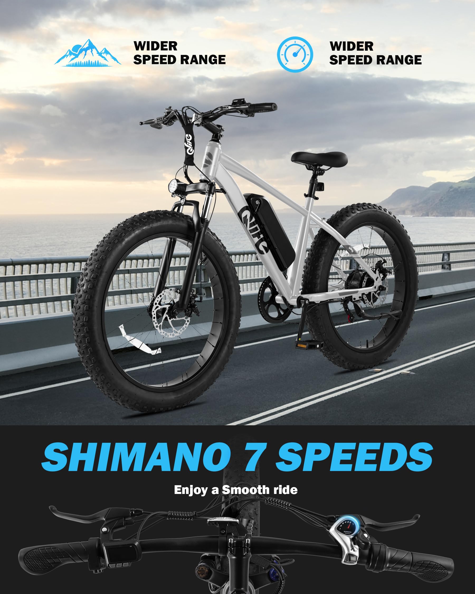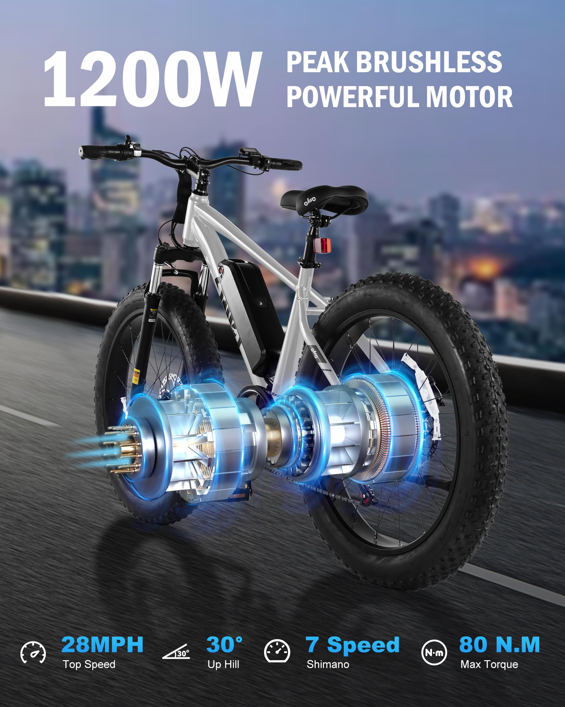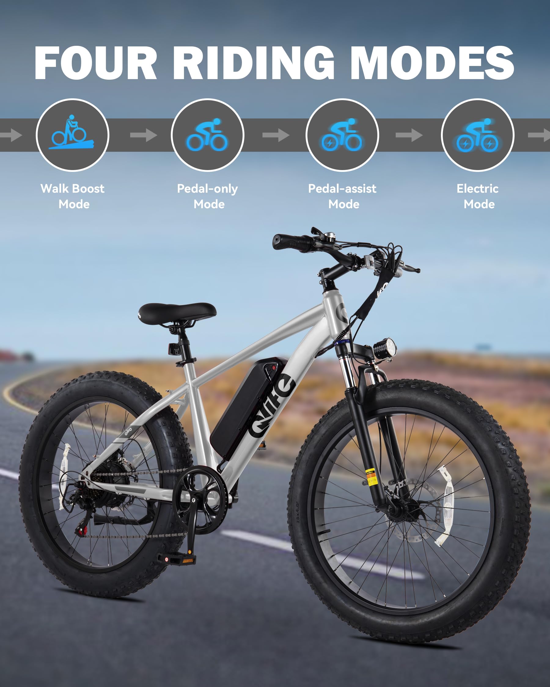 【Powerful Brushless Motor】The Racer Plus fat tire electric bike is equipped with a high-speed PEAK 1000W brushless motor, reaching up to 28MPH. Easily tackle steep hills and off-road terrain with its robust power and smooth performance. Switch smoothly between 4 riding modes to match your adventure