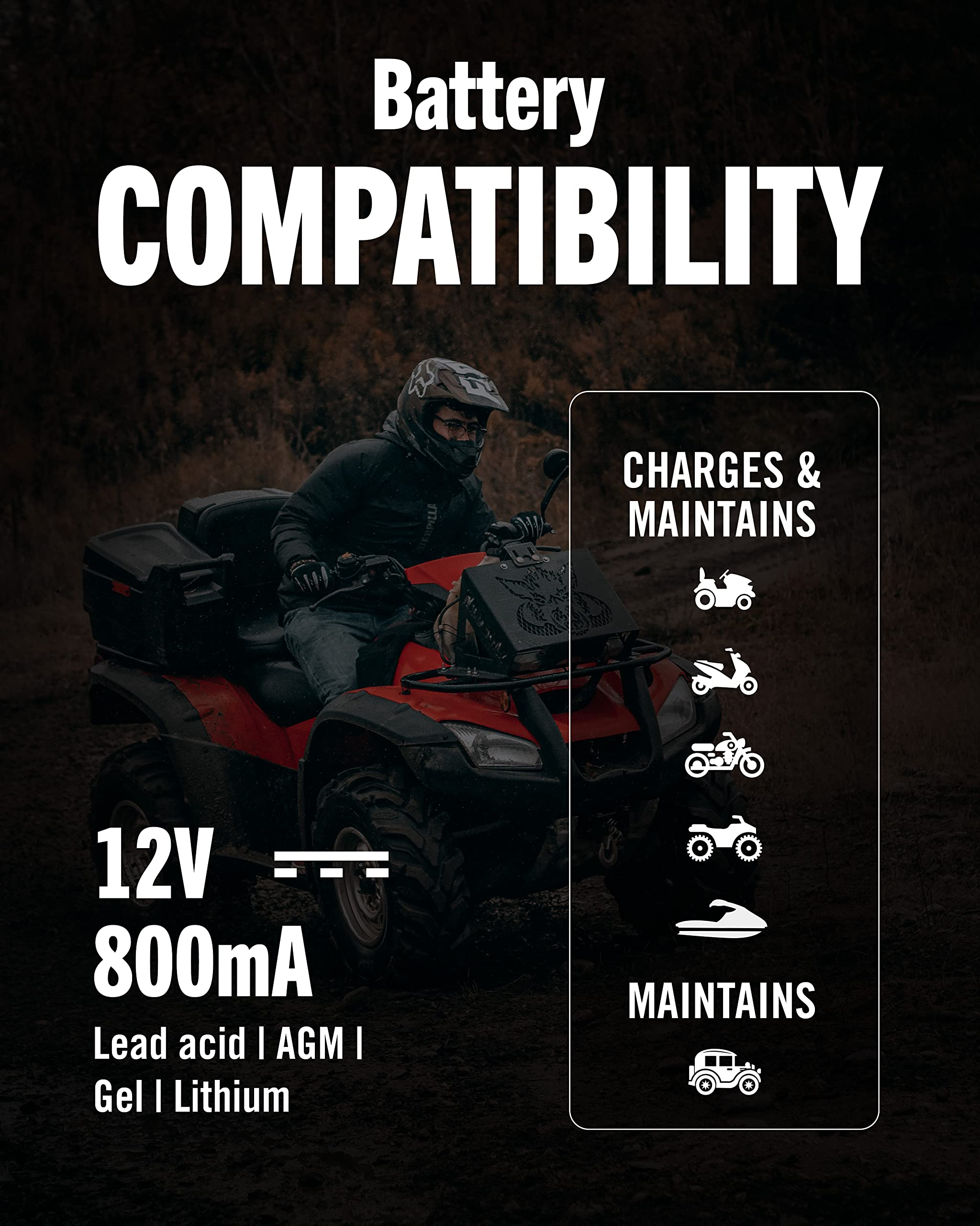 Stay Charged: 12V Battery Charger, 800mA Selectable Lead Acid/Lithium Battery Charger It will keep your battery fully charged so that it is ready to go when you are