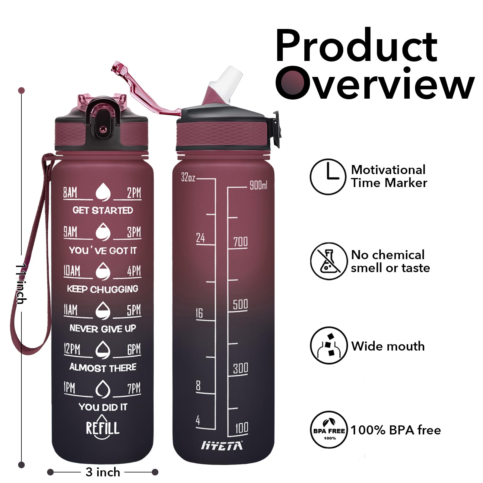 Motivational Quote and Time Marker: 32 oz water bottle with time markers and inspiring quotes, great for tracking daily water intake and staying hydrated.