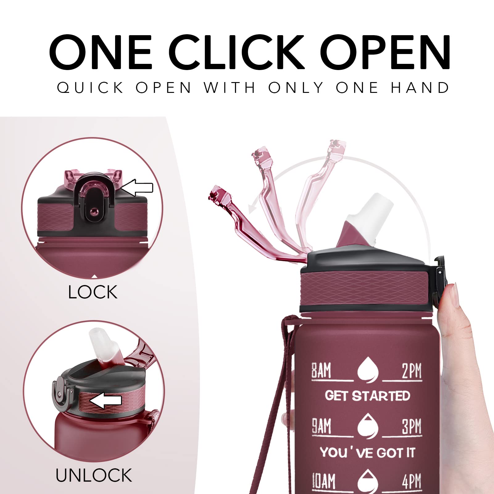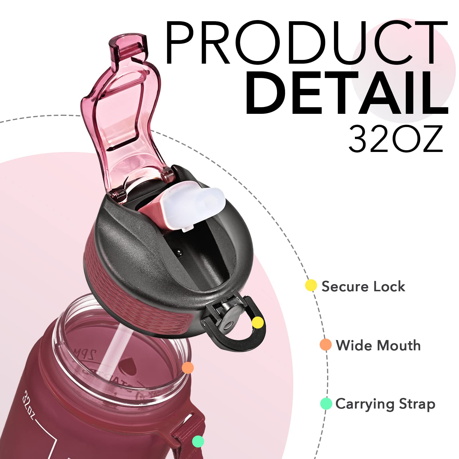 Functional Design: The bottle with straw allows for spill-proof sipping; The flip-top lid has a secure lock leak and can be opened easily with one hand; The wide mouth fits ice and is easy to clean.
