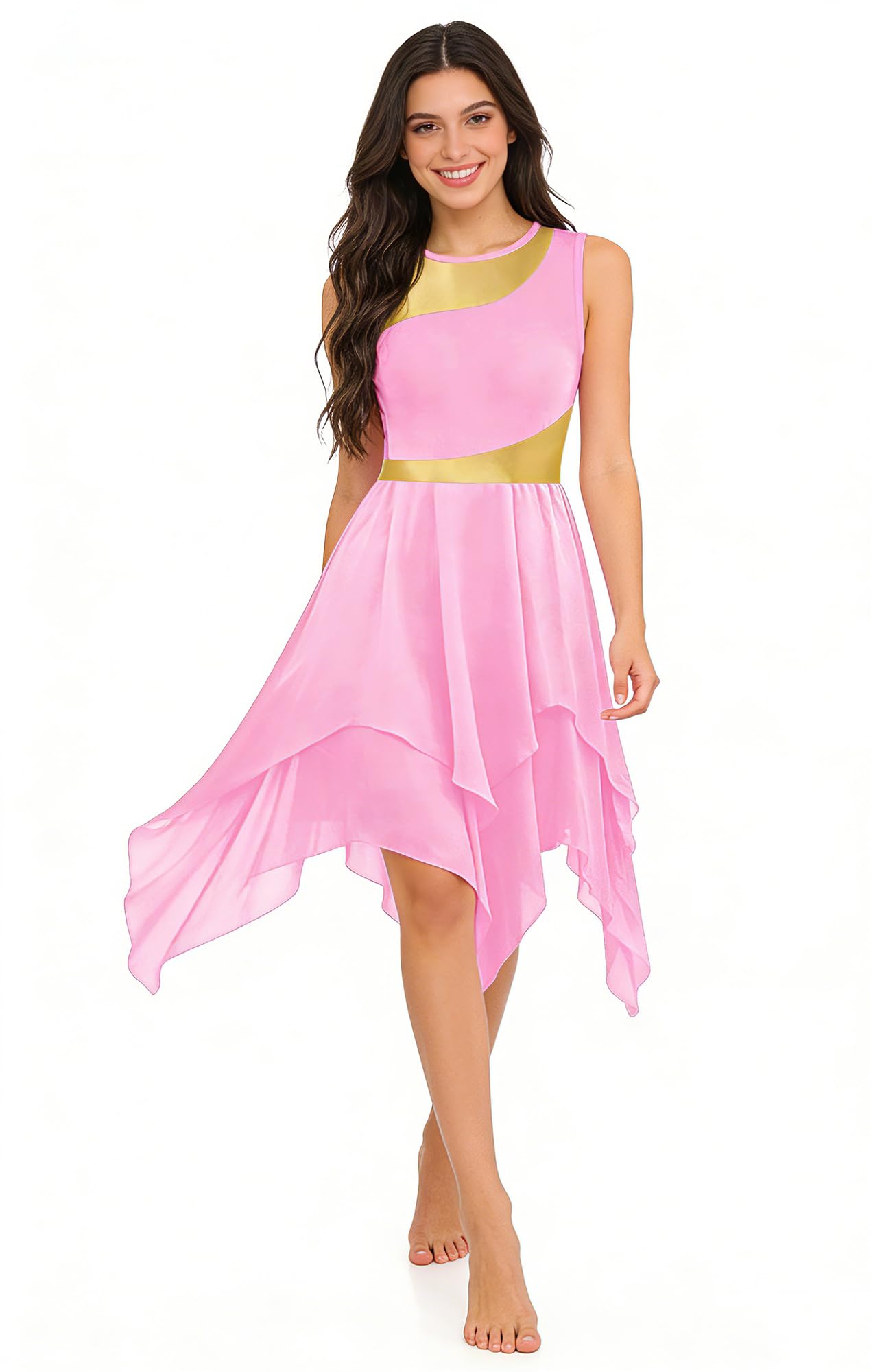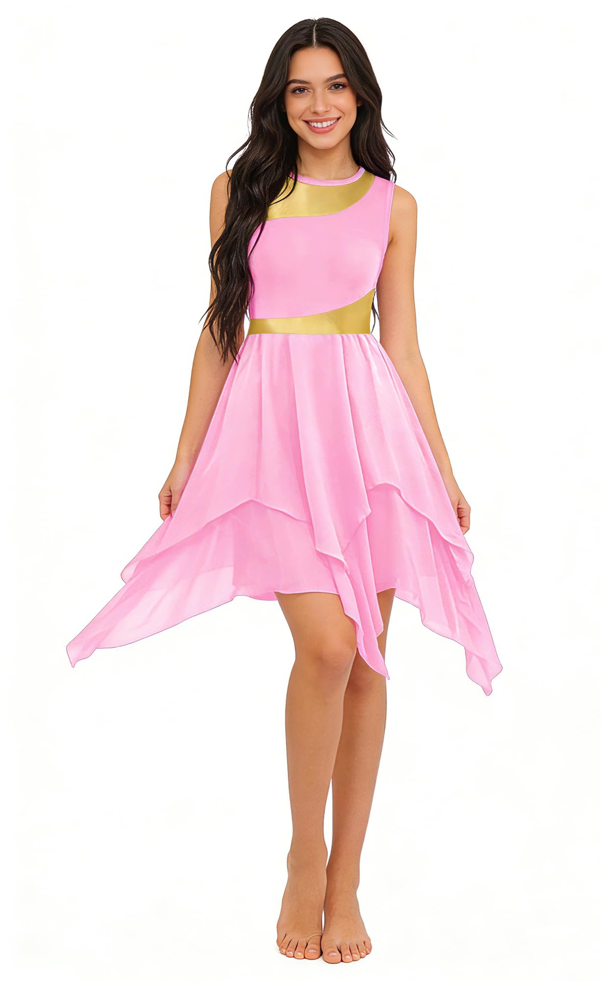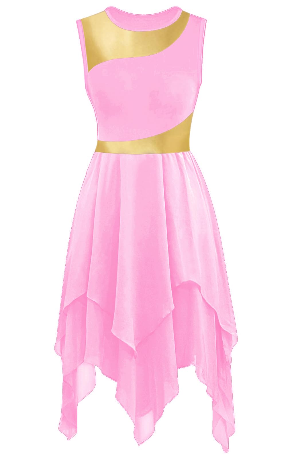 UNIQUE DESIGN: Sleeveless irregular hem ruffle praise lyrical dance dress, crew neck, pull-on closed, metallic color block patchwork, double-layer chiffon irregular hem big swing flowy skirt (White may be a bit seen through). can be looks flowy and graceful when twirling or moving.