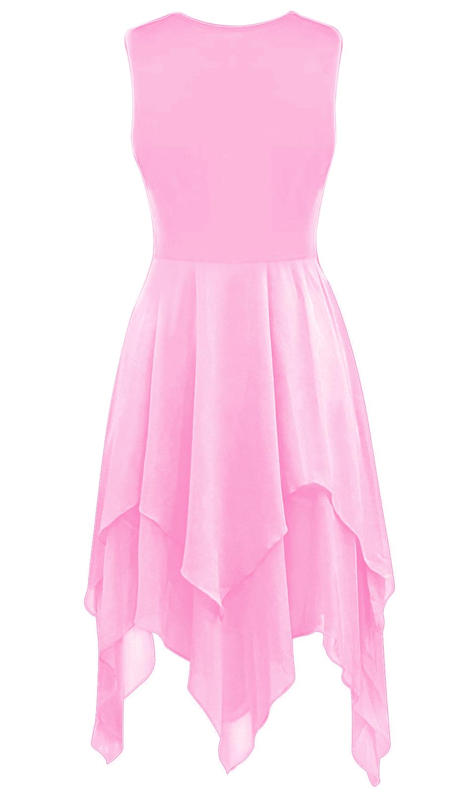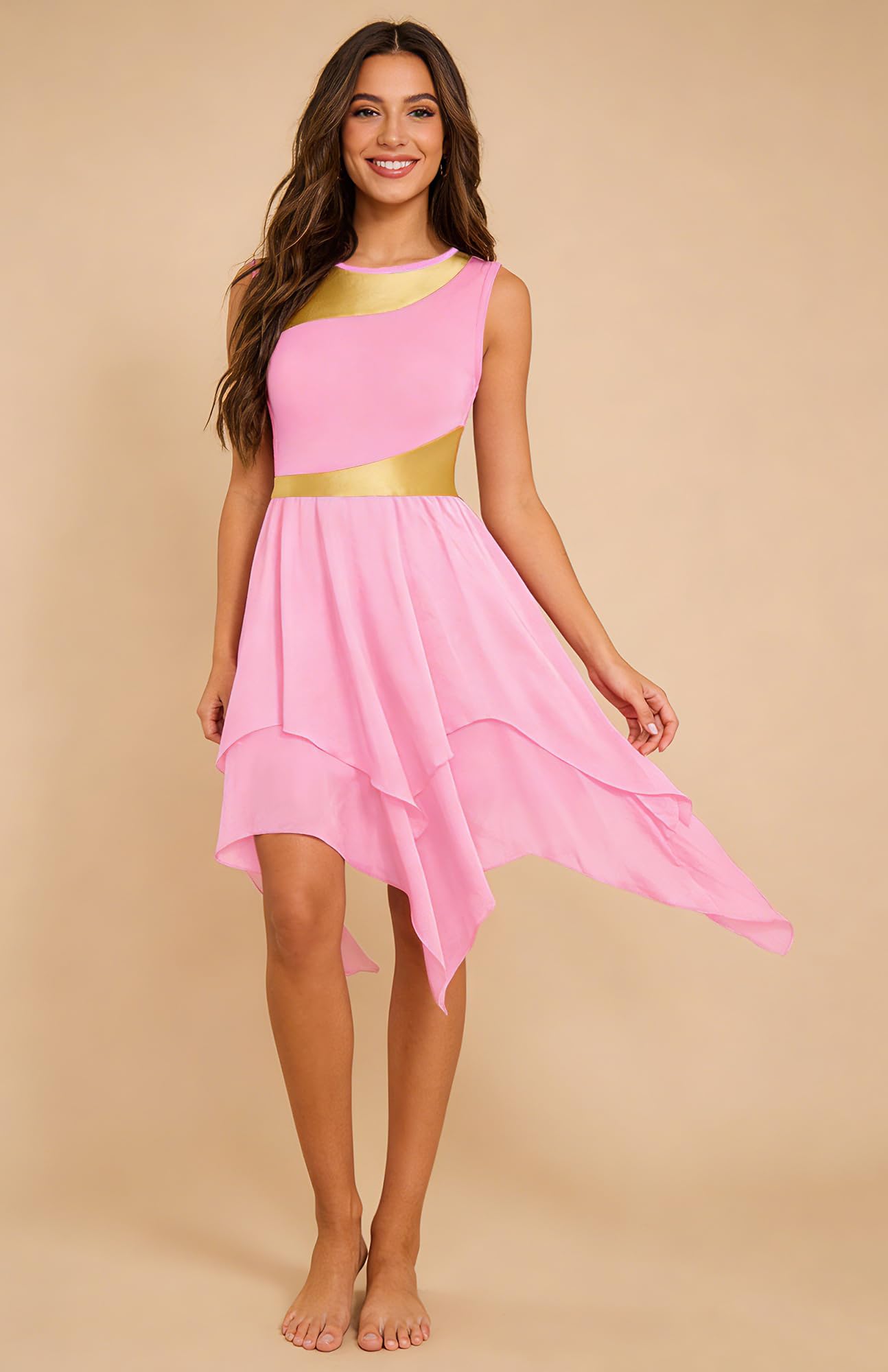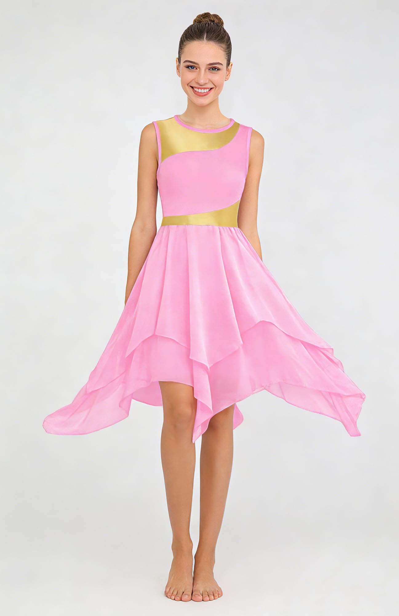 UNIQUE DESIGN: Sleeveless irregular hem ruffle praise lyrical dance dress, crew neck, pull-on closed, metallic color block patchwork, double-layer chiffon irregular hem big swing flowy skirt (White may be a bit seen through). can be looks flowy and graceful when twirling or moving.