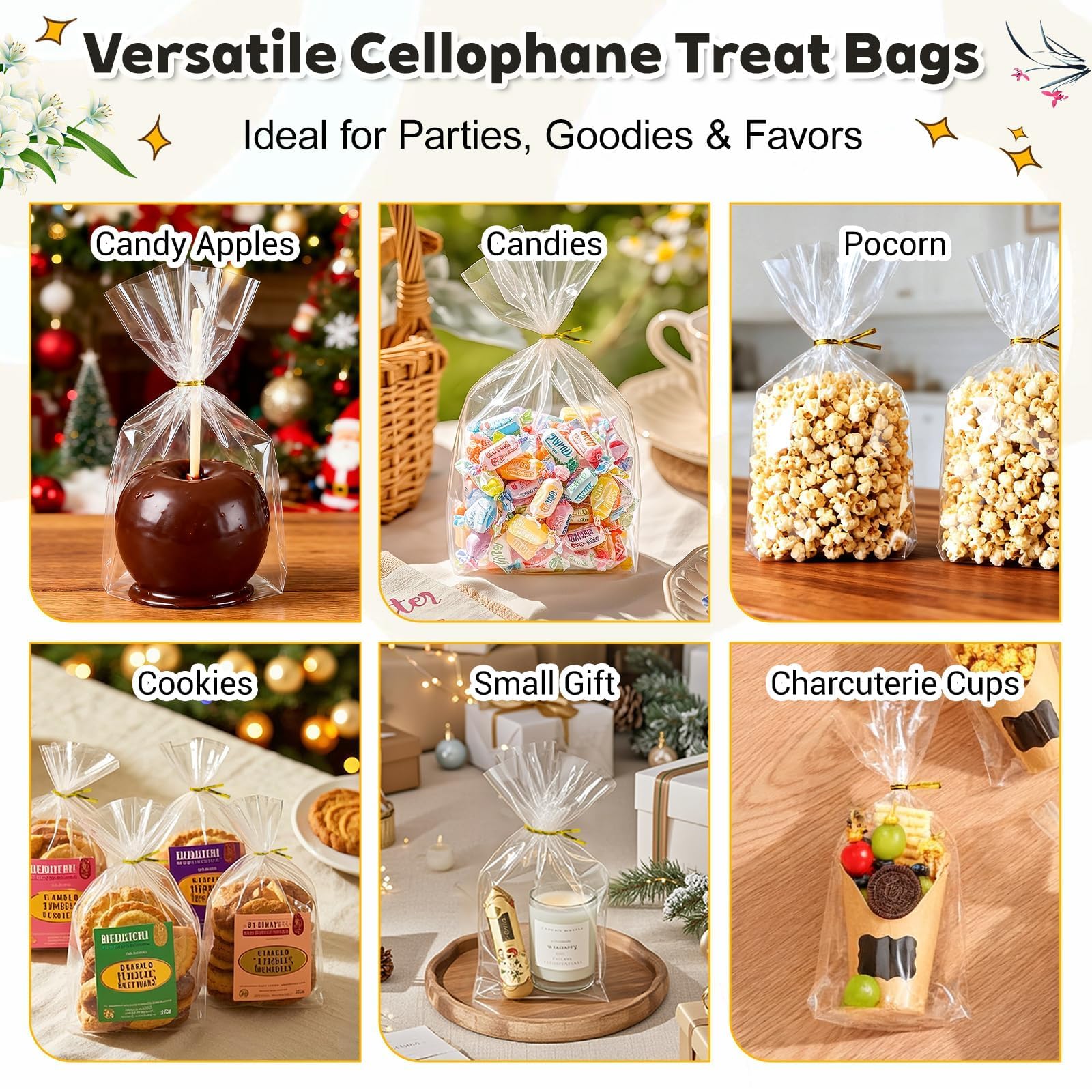 Complete 100-Piece Set – Ready-to-Use Packaging Solution: Includes 100 Pcs 6"x9" small clear gift bags and 4.7" gold twist ties. These goodie bags for birthday party are easy to open, fill, and seal, making gift wrapping quick and stress-free. The included twist ties add a gift-ready look—ideal for birthdays, Christmas holidays, DIY creations, or party favor packaging