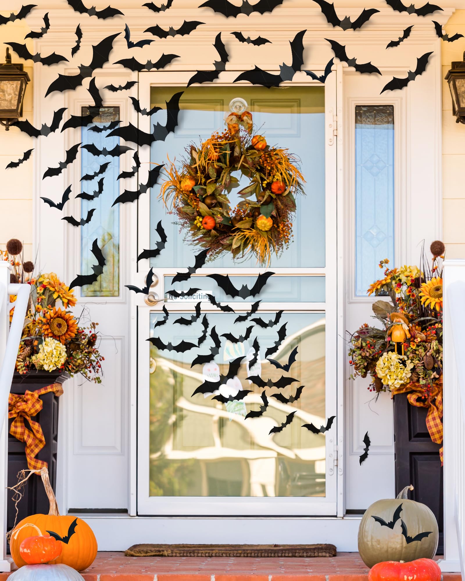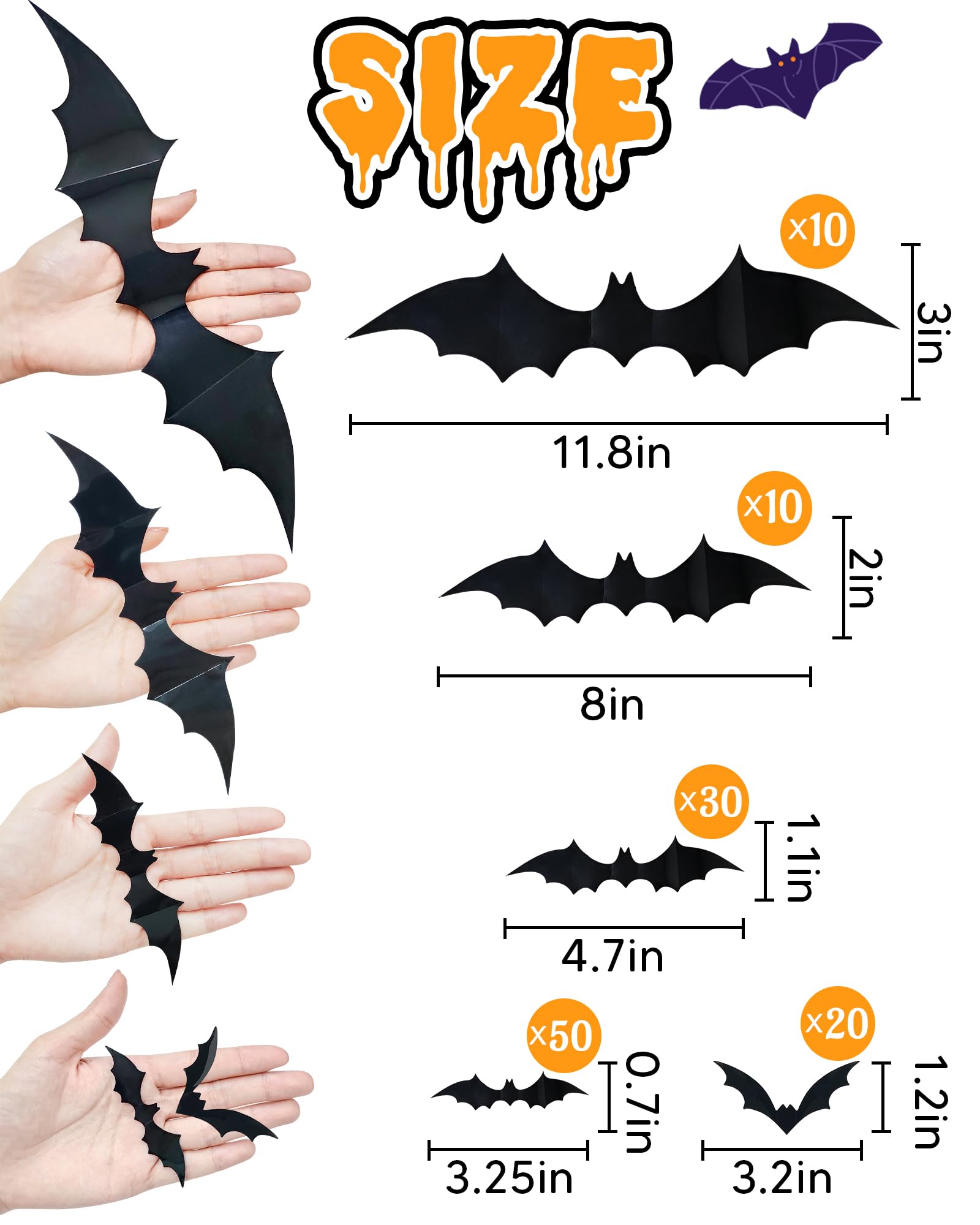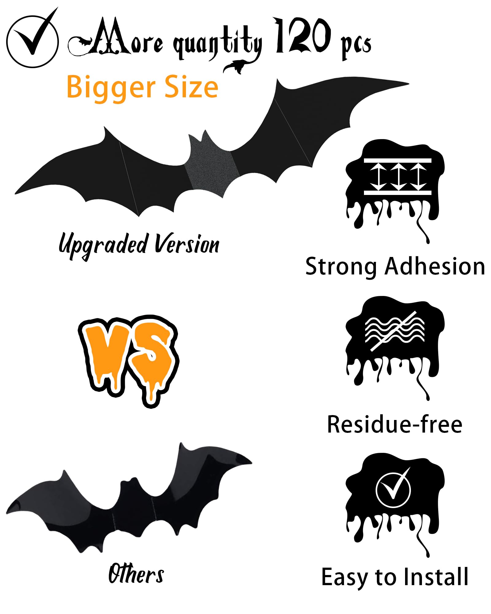 Upgrade Sizes and Quantity: A set of 120pcs 3D Halloween decorations bats in 5 different sizes,10pcs11.8x3in, 10pcs 8x2in, 30pcs 4.7x1.1in, 20pcs 3.1x0.78in and 50pcs 3x0.7in,which can meets your different decorating needs. It also comes with doubled-sided adhesive pads for your convenience.