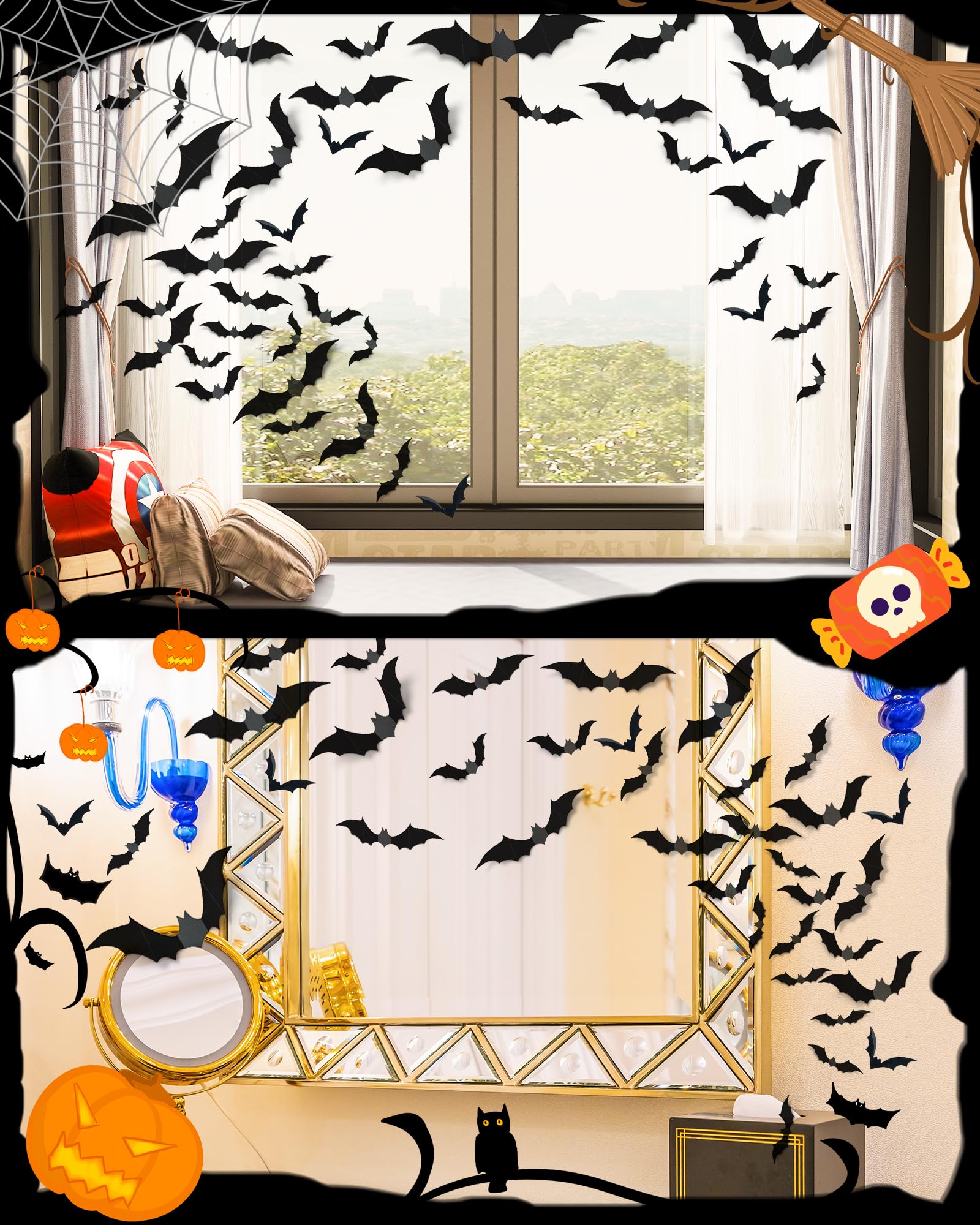 Wide Applications: Our Halloween bats are perfect for Halloween themed party. It can be used for Halloween decorations indoor and outdoor, such as bedroom, living room, bathroom, mirror, cabinets, bookshelf, walls, doors, windows, which will add a horror atmosphere to your Halloween party.