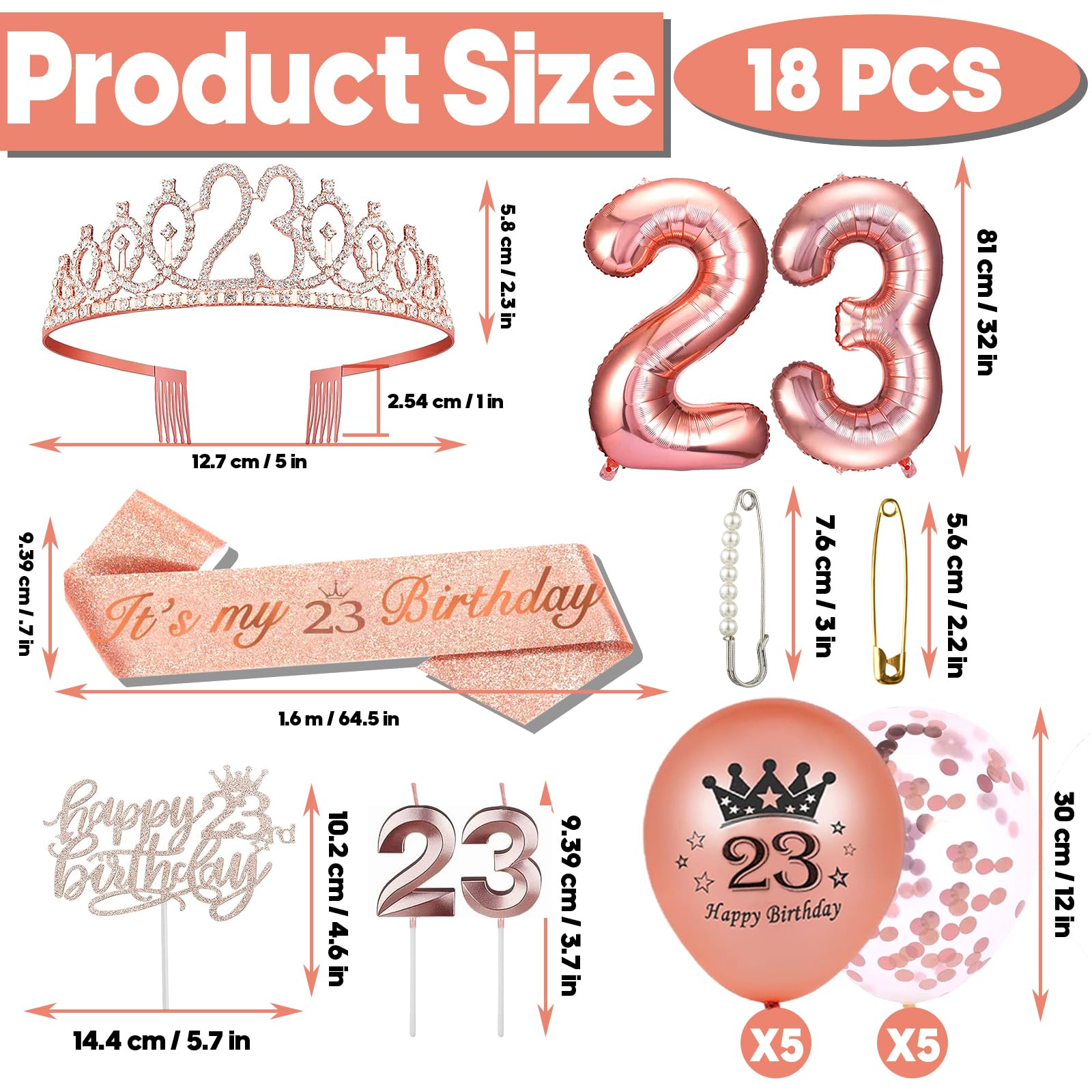 【23rd Birthday Decorations】: Package coming with rose gold 23 birthday crown 1pc, 23 birthday sash 1pc, 23rd birthday balloons 12pcs, happy 23rd birthday cake topper 1pc, 23rd birthday candles, This Birthday Gifts for women remind her and everyone in the 23rd birthday party how fabulous she is.