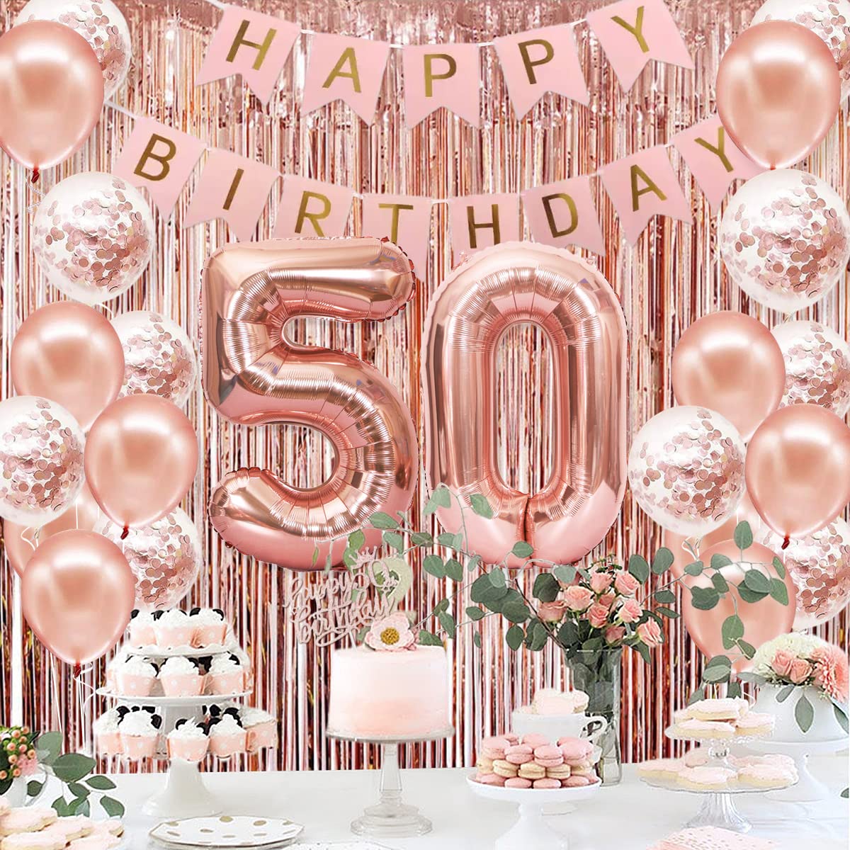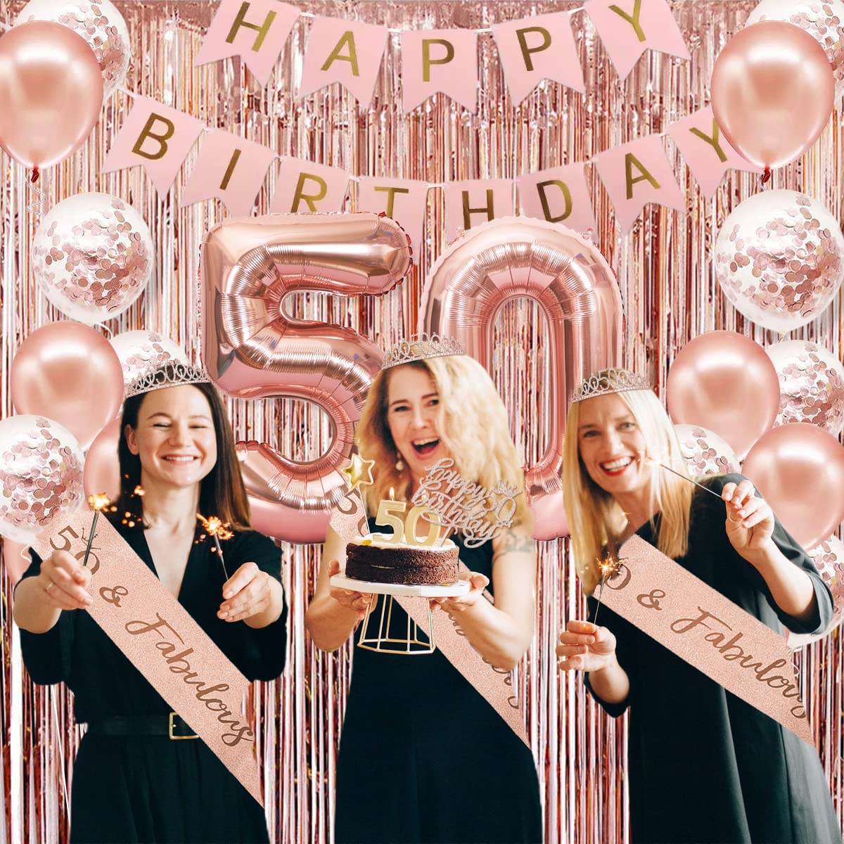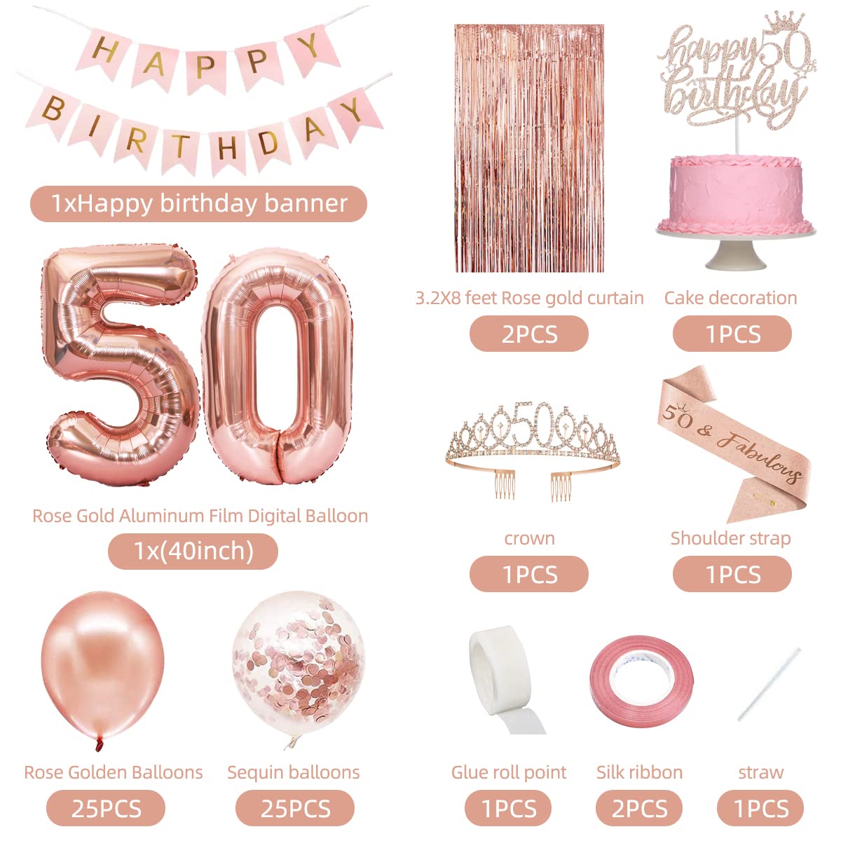 50TH BIRTHDAY DECORATIONS SET: 1 x 50th birthday crown, 1 x rose gold 50th sash, 1 x happy 50th birthday cake topper, 1 x rose gold 50 number balloon (40 inch), 1 x happy birthday banner, 2 x rose gold fringe curtain (3.2 X 8.2ft), 25 x metallic rose gold balloons and 25 x rose gold confetti balloons (12 inch), 1 x inflating straw, 1 x balloon glue dot (100pcs dots in total), 2 x balloon ribbons (66ft in total), 1 x gold pin. You will organize the perfect happy 50th birthday party.