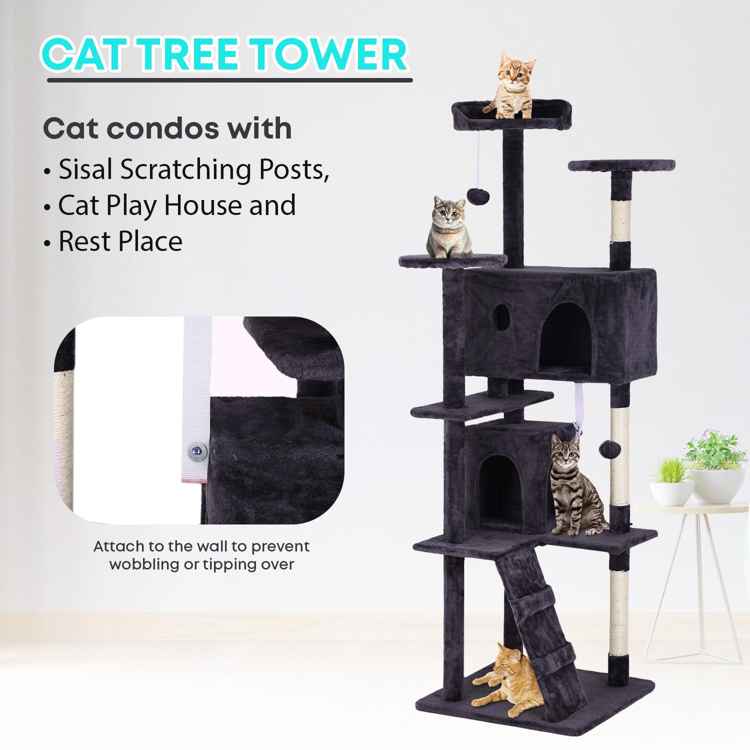 Our towering haven of a cat tree, with its finely detailed construction, offers your cherished companion the ideal balance of activity, comfort, and repose. This multi-level masterpiece, standing tall and robust, is made to fulfill all of your cat's innate impulses. Our cat tree offers a variety of inviting features to keep your pet happy and occupied for hours on end, from comfortable hideaways for seclusion and relaxation to plush perches for relaxing and surveying their territory. In addition to providing a safe haven for scratching, its scratching poles are covered in sturdy sisal rope, protecting your furniture from needless abrasion. Because of its modular form, which makes installation and modification simple, it blends in perfectly with any living area while bringing a touch of charm and elegance. Every cat lover's dream home must have a Cat Tree because it offers the ideal haven for your cat, whether they are playing, lounging, or just curled up for a good night's sleep.Cat Tree;Cat Tower;Cat Scratching Post;Cat Tower for Indoor Cats;Cat Tree for Indoor Cats